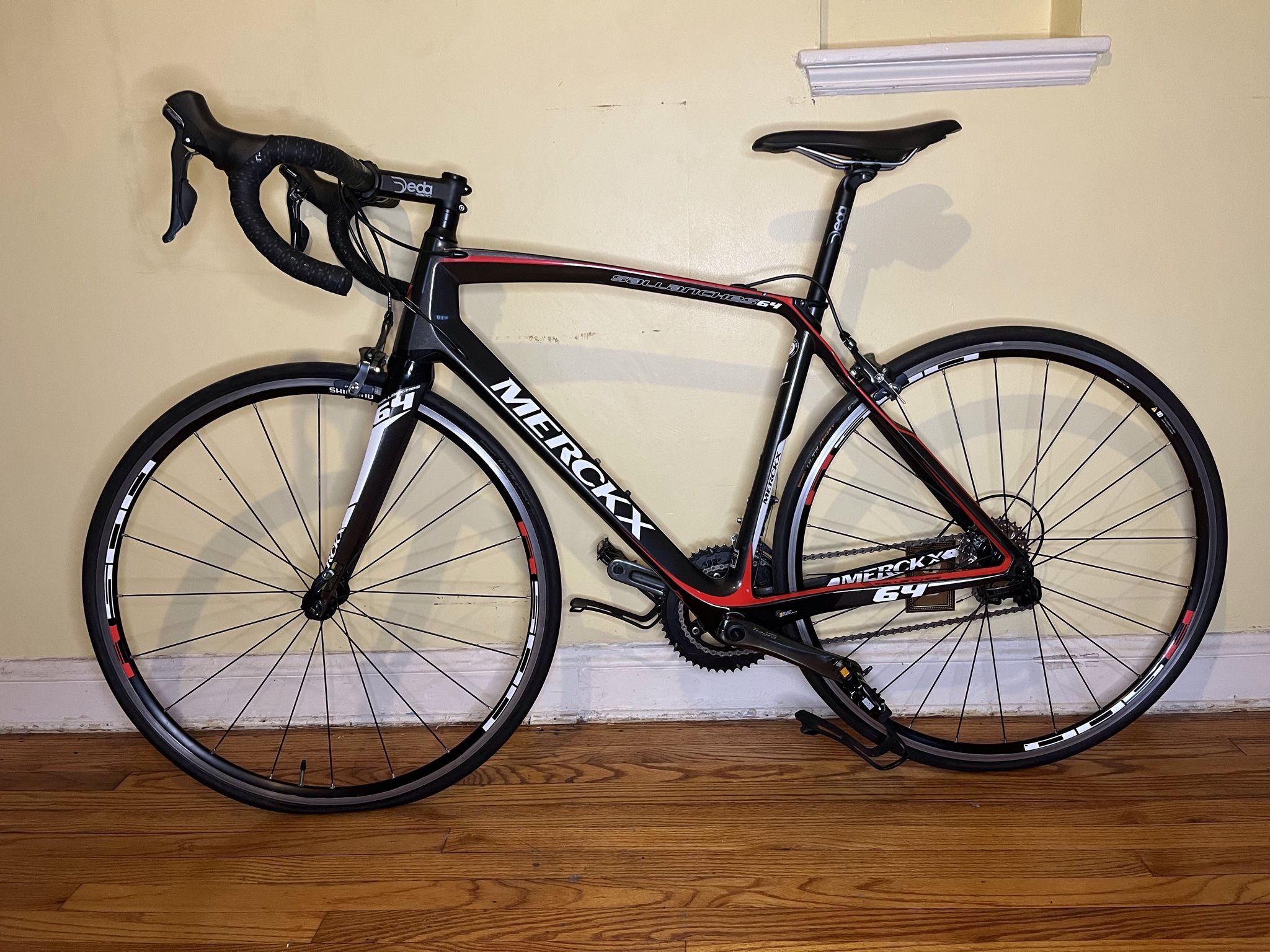 Eddy Merckx Sallanches 64, 2017 version Road Bike 57cm frame on both horizontal frame and seat post All carbon fiber, very lightweight All quality Tiagra components: rear brake, front break, shifters, derailer, and crank Tune up completed: Brand new bar wrap New rear cassette New break pads New chain She is ready for a new home and ready to be ridden! Talk to me nicely in DM