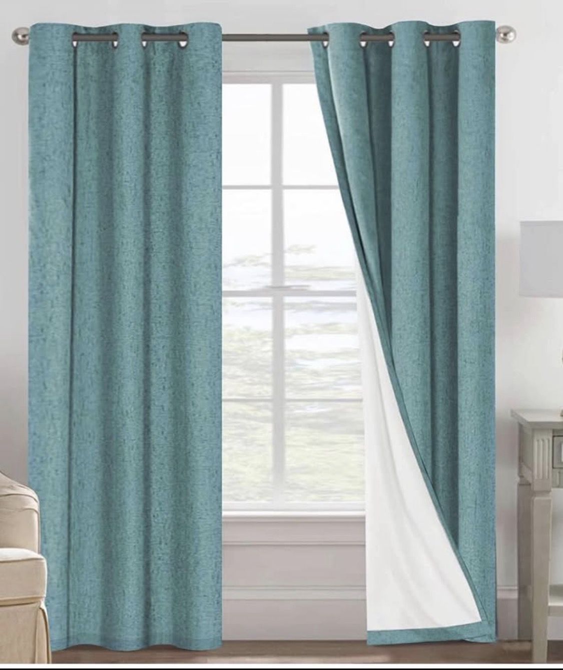 Vibrant KEECO teal grommet curtains. These are 42in x 84in. Base fabric is 100% polyester, flocking is 100% rayon. Easy to care for, machine wash cold. Great for adding a pop of color to your room.