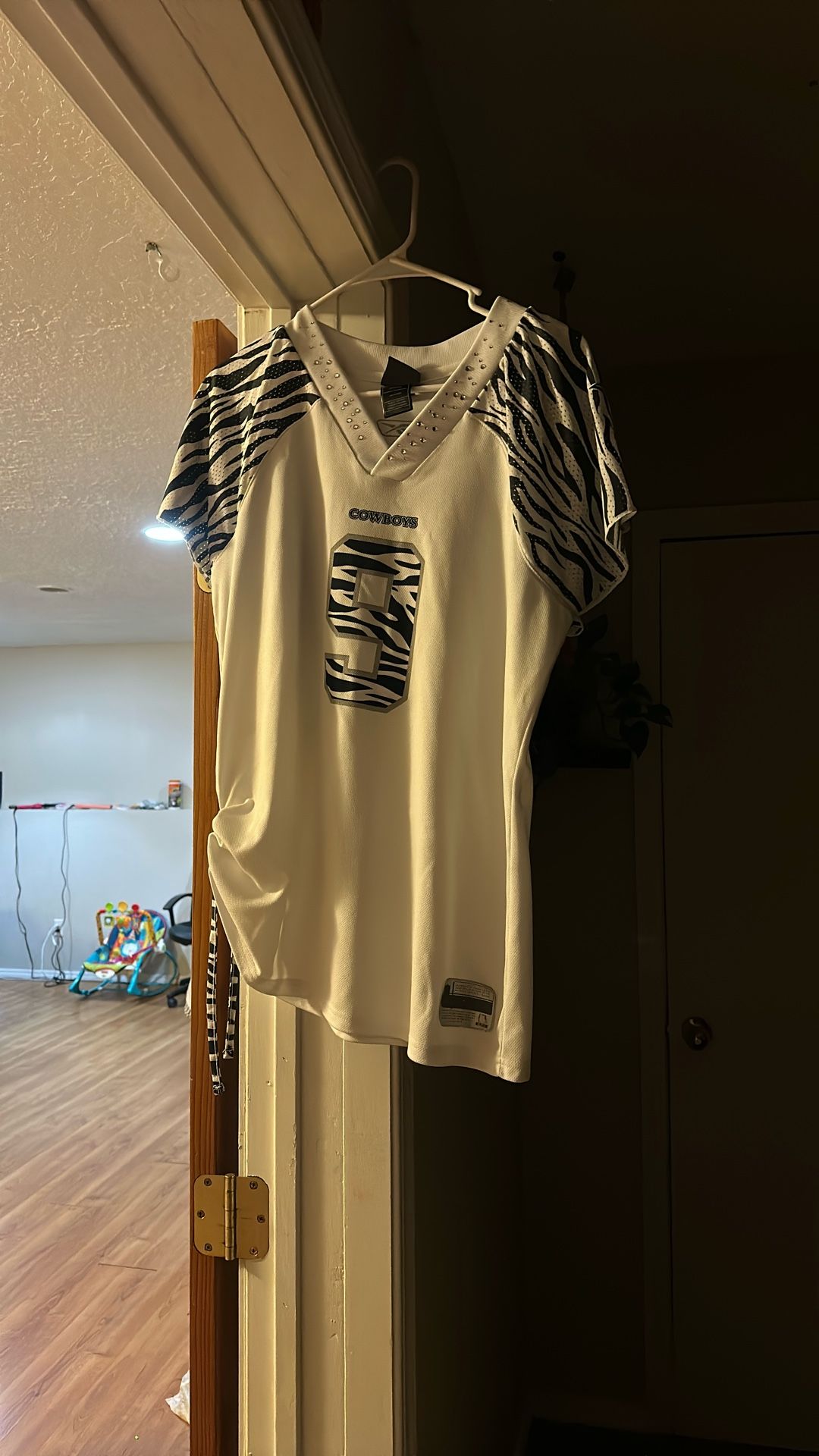 Lighting is throwing the picture off but it is a white cowboys shirt for a lady. Size Lg