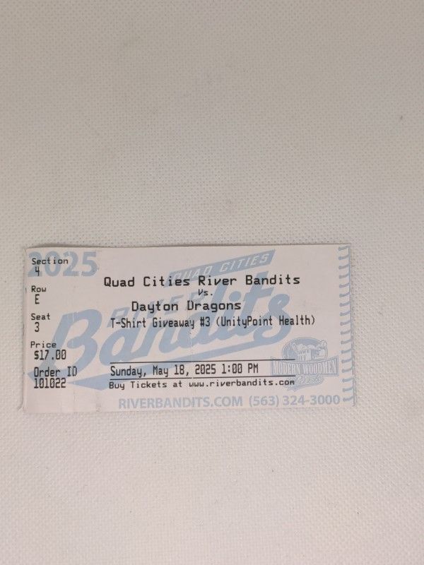 Quad Cities River Bandits vs Dayton Dragons May1 8, 2025 1 PM Ticket