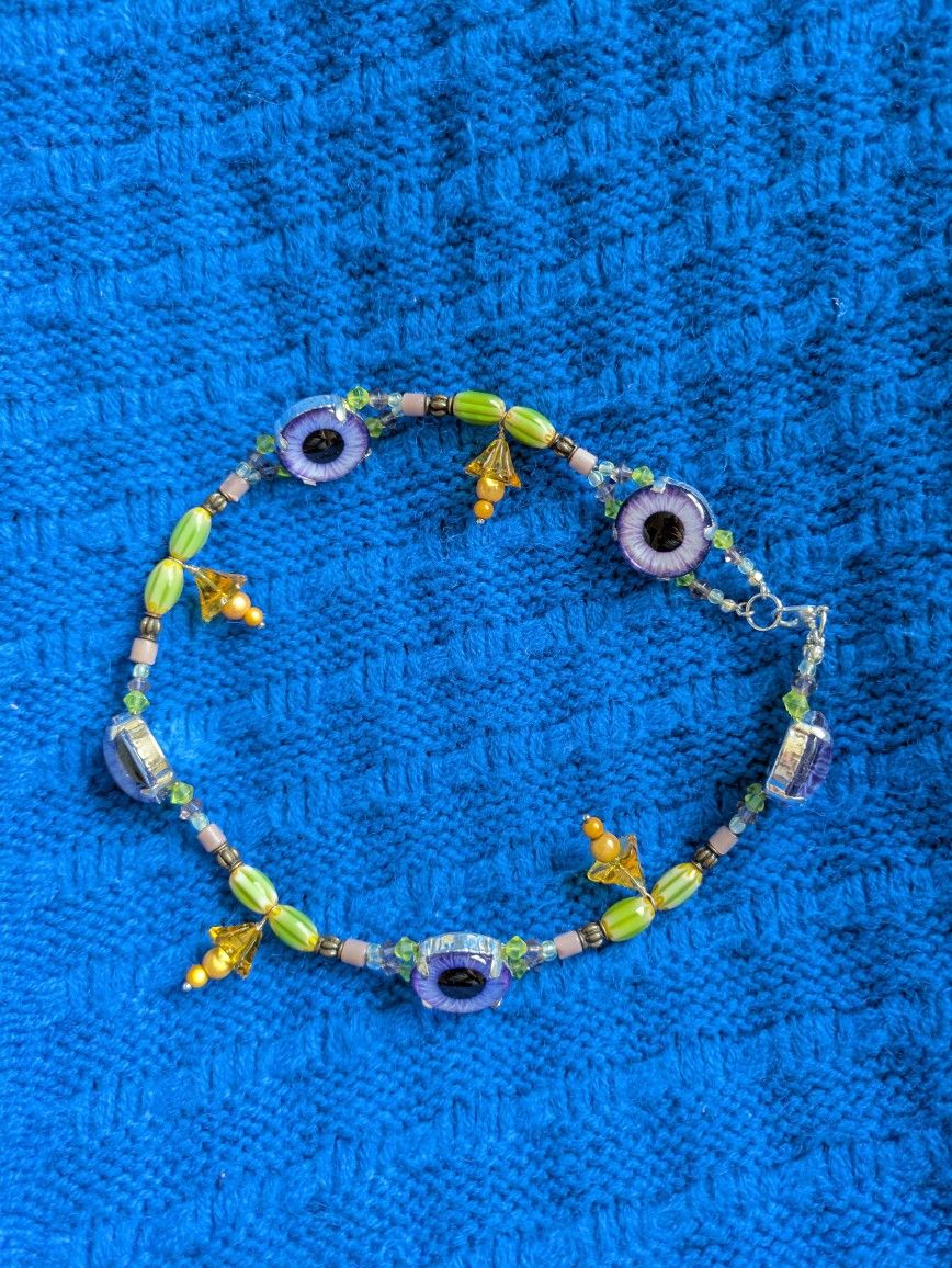 Handmade Beaded Eye Necklace- handmade beaded necklace featuring a lobster closure and beautiful blue eye charms, chocker length. Can't find the name of the original creator, but she did a great job.