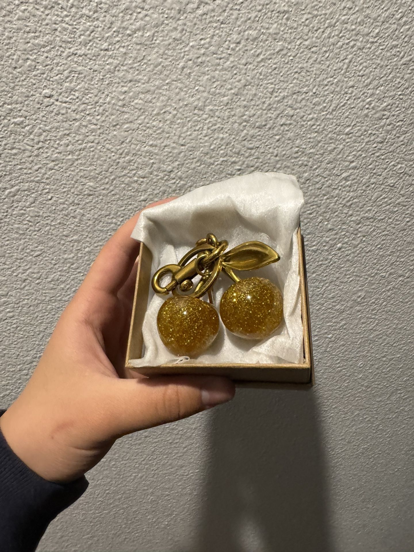 This summery bag charm features a retro-cool cherry motif in glittery resin. Clip it to a favorite bag or set of keys for refreshing style. Brand new, just didn’t end up wanting it.