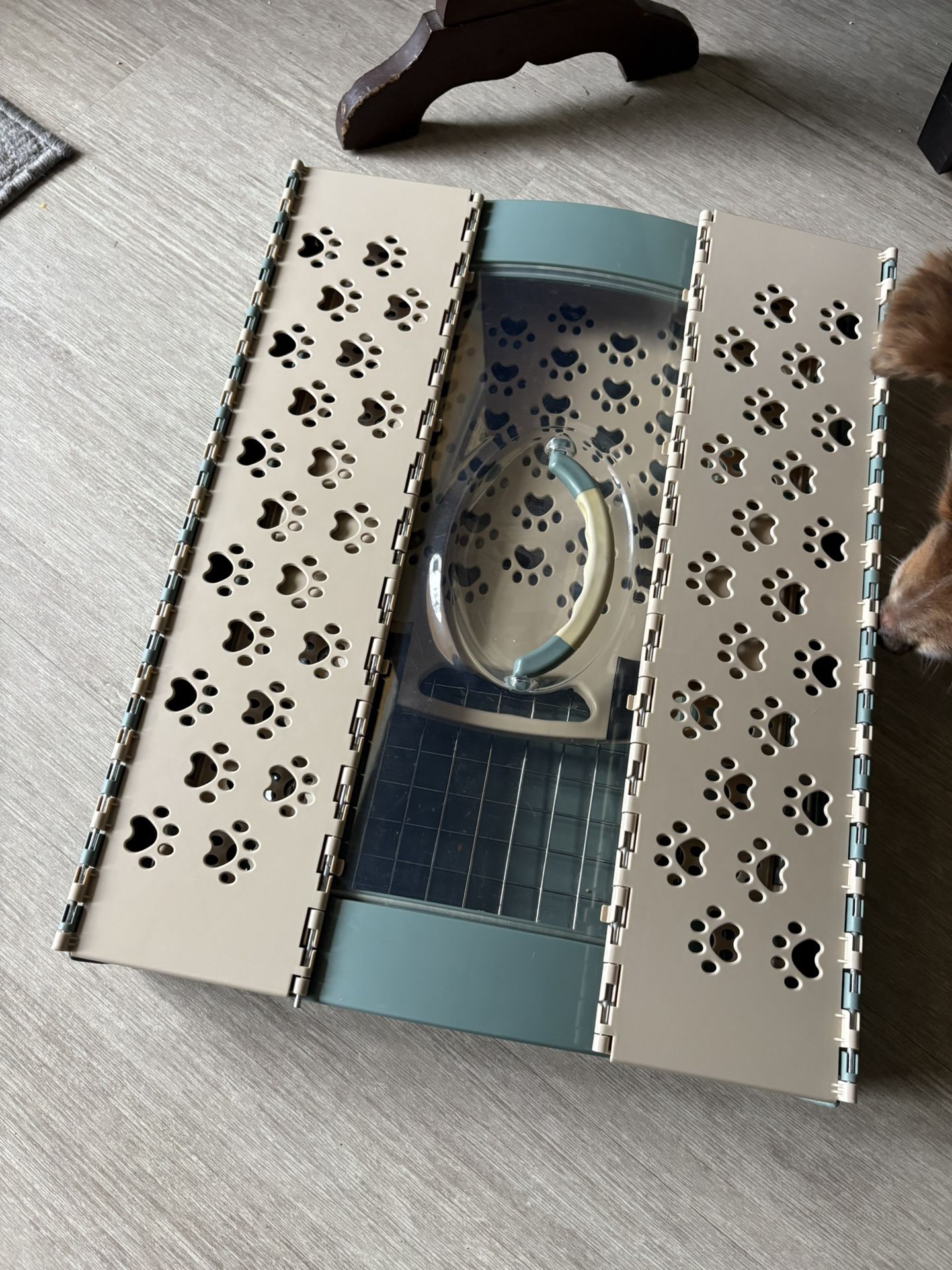 Will sell separately 1. Top-Loading Clear Lid • The transparent plastic top with a built-in handle allows: • Easy loading from above (great for cats or nervous animals). • You to see the animal inside without opening the carrier. • The lid secures with three side latches for safety. 2. Ventilated Side Panels • The tan panels with paw-shaped ventilation holes offer: • Good airflow. • A cute aesthetic. • These appear to fold, which may mean the carrier collapses for storage. 3. Front Metal Door • A sturdy wire door with a rotating latch mechanism. • Suitable for keeping pets secure during travel and preventing escapes. 4. Hard Plastic Bottom Tray • Provides stability. • Easier to clean in case of accidents. • Some models include a removable grate—but your interior looks like smooth plastic. 5. Carry Handle on Top • Comfortable for carrying short distances (vet visits, car rides, etc.). ⸻ 🐶 What Pets This Carrier Is Good For This size and style are typically suited for: • Cats • Small-breed dogs (up to roughly 10–12 lbs) • Rabbits • Ferrets • Guinea pigs (for short trips—not for long-term containment)