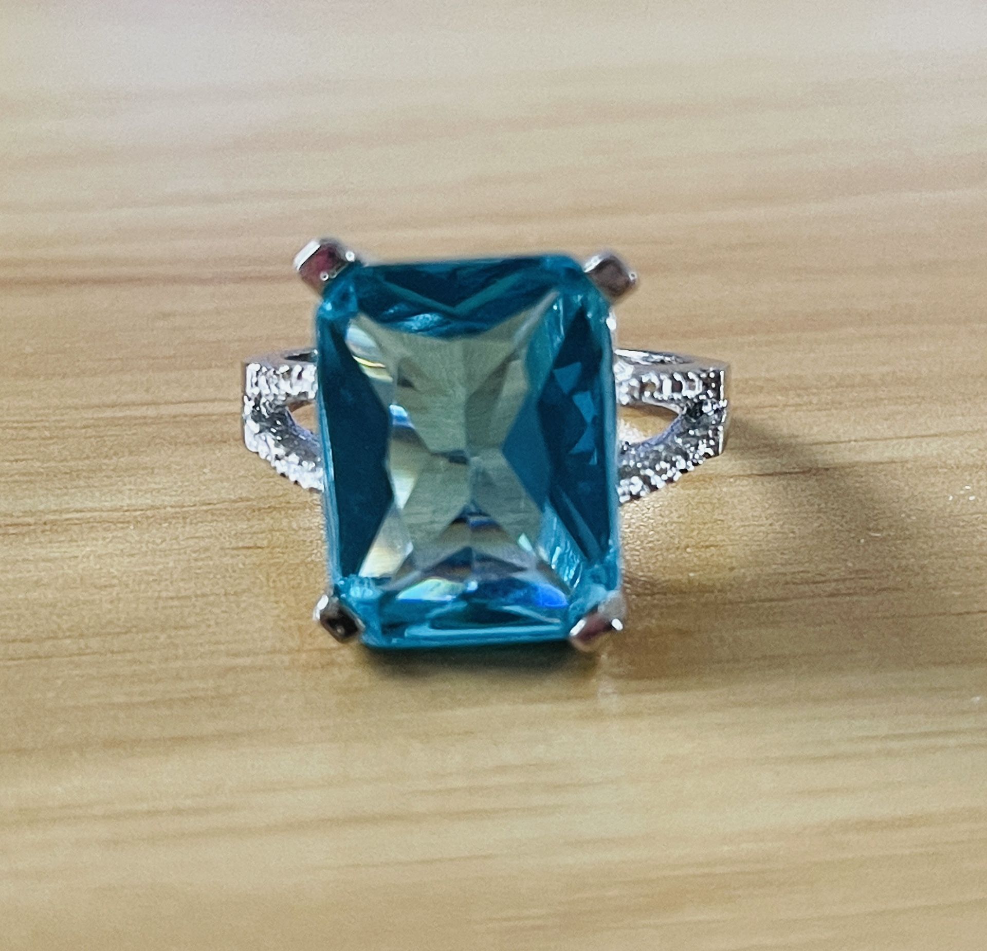 Large Blue Gem On Silver Tone Cocktail Ring Sz 9