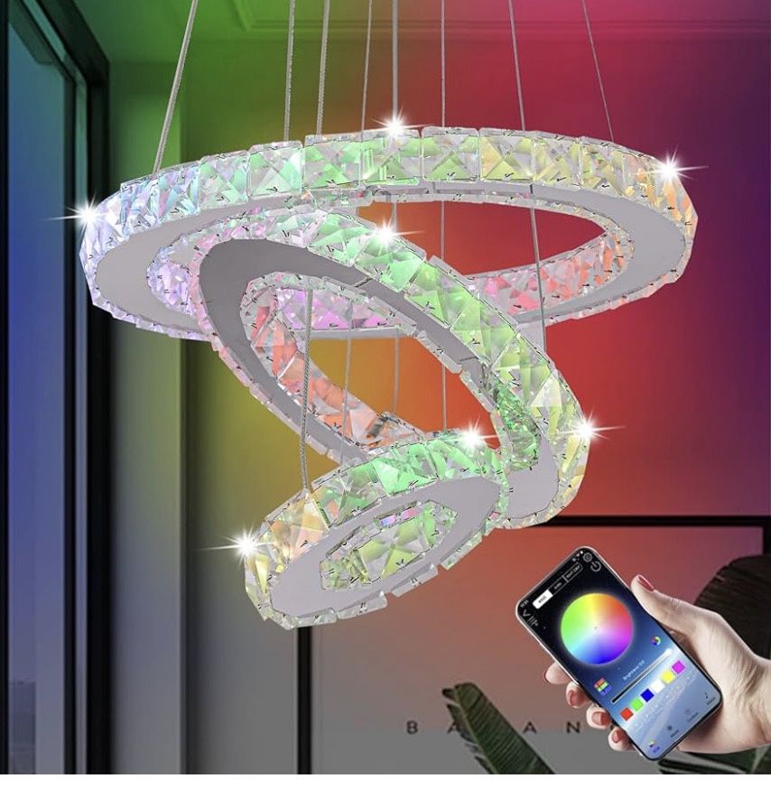 NEW! 3 Ring RGB MULTICOLOR Chandelier Crystal Smart Modern Adjustable Ceiling Light w/REMOTE, Chrome
