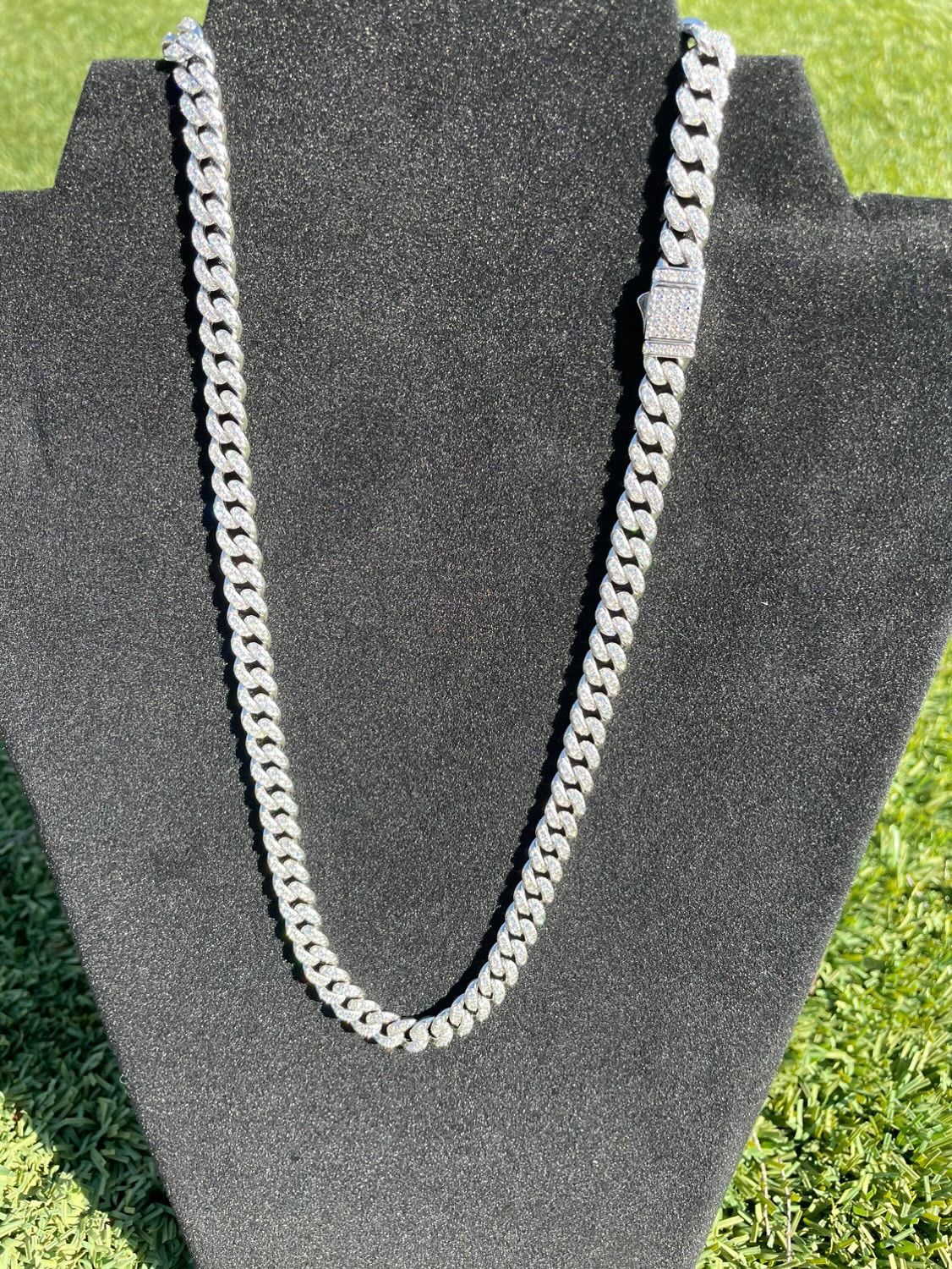 Amazing quality cuban chain is flooded in VVS moissanite stones, they shine beautifully similar to a natural diamond for a fraction of the price. Will pass any diamond tester with flying colors each and every stone was handset by a professional diamond setter no machine work. Chain is solid 925 silver, with a rhodium plating to make it look like white gold. 8mm 20"