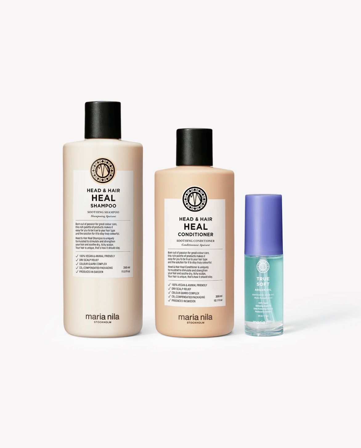 Great hair, on repeat – soothe your scalp and boost hair strength with this limited-edition set with shampoo, conditioner and hair oil. A soothing and strengthening with calming aloe vera extract. The active ingredients in Head & Hair Heal Shampoo helps balance your hair and scalp for a healthy look and feel. The shampoo has a flowery scent of jasmine and linden blossom. Dry scalp relief Calming aloe vera extract Sulfate & paraben free 100% vegan and animal friendly