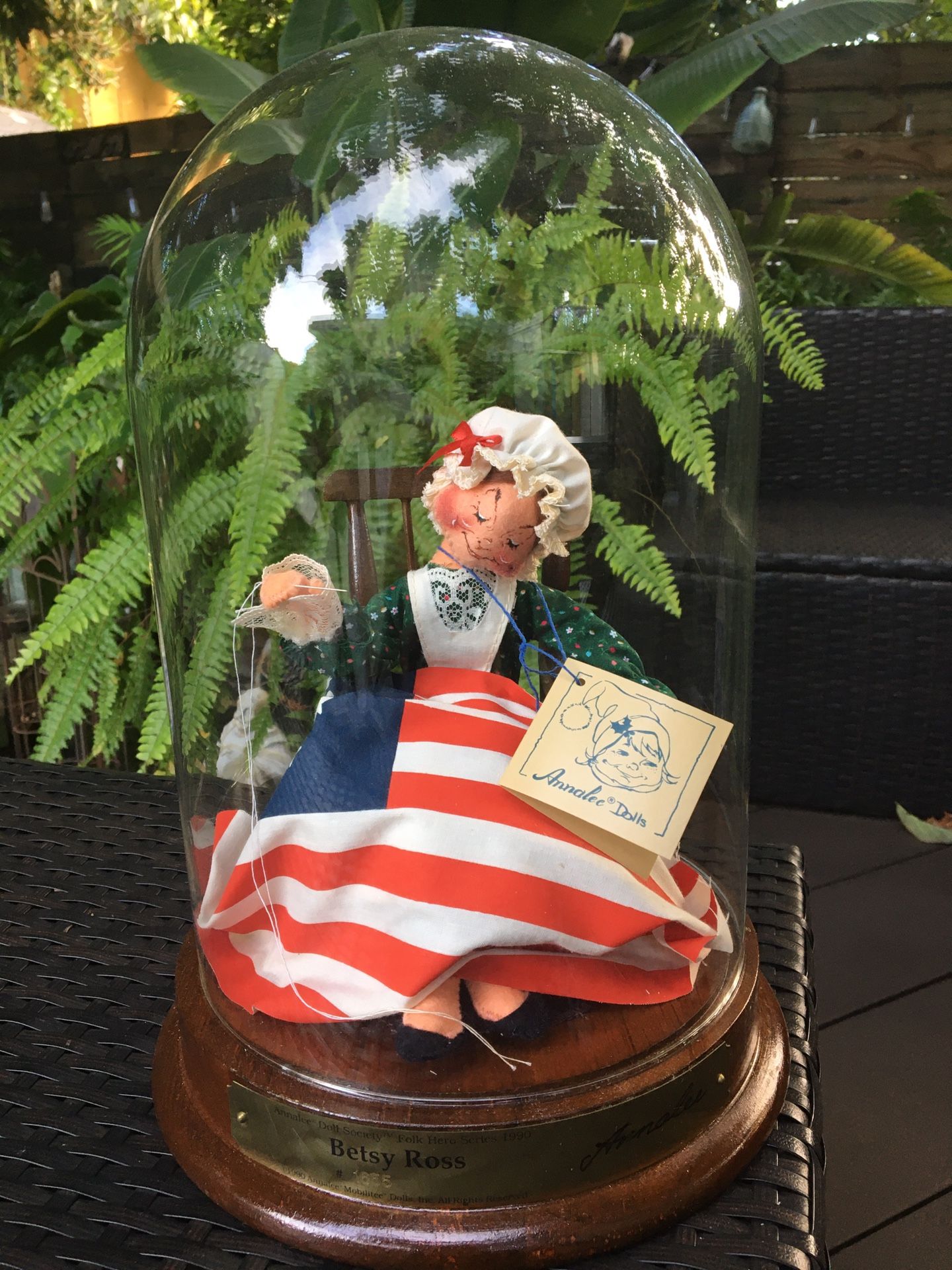 ANNALEE DOLL SOCIETY FOLK HERO SERIES 1990. Betsy Ross #1655. Wood stand 9.5” wide with glass globe 14” high. Sells on eBay for $125