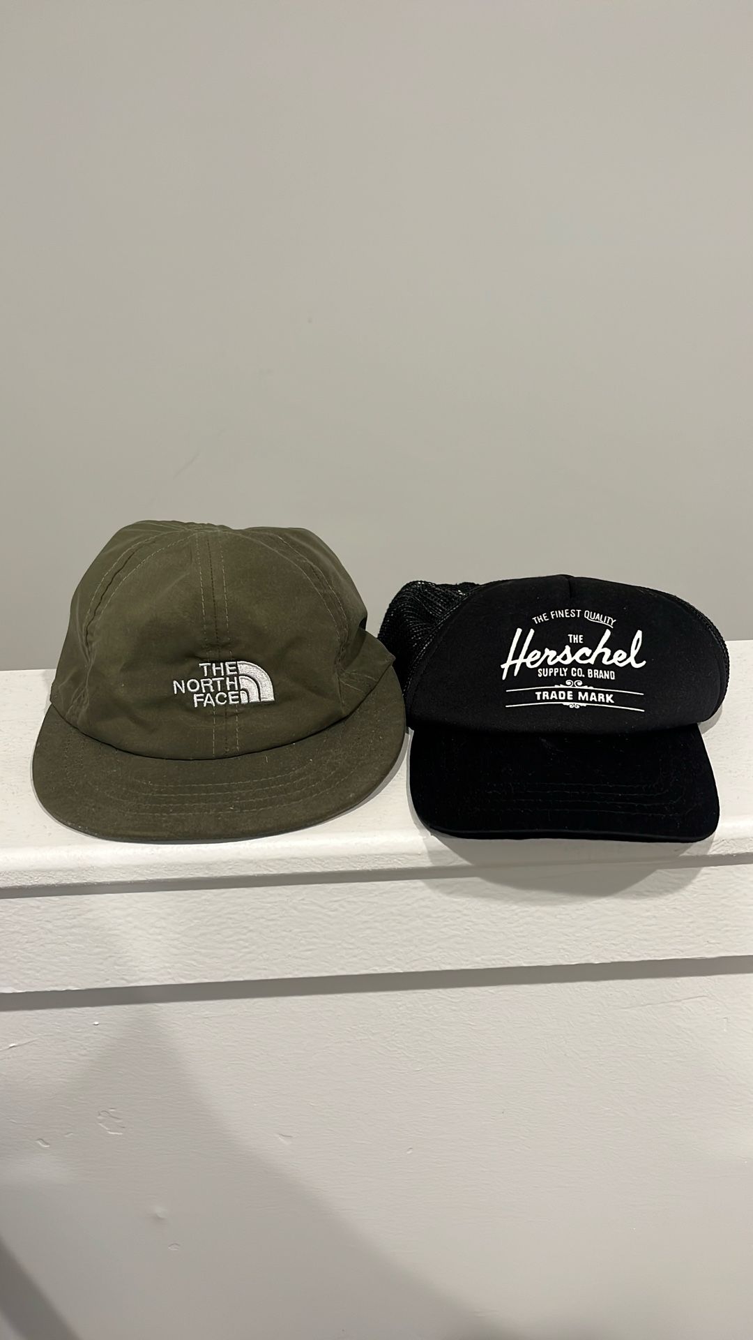 The Northface hat is reversible. The Herschel supply hat is a trucker style. Fits baby’s head