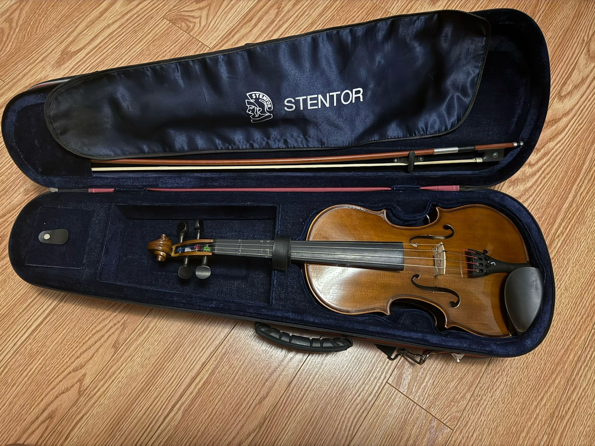 This was used with minor wear bought about 2-3 years ago. It was used as a beginner violin and is perfect if you want to get started and have a violin with a good price and quality. Comes with 4/4 full size violin, original stentor rosin, dust cover, case and bow with pearl inlay. The original price of this model was $200.