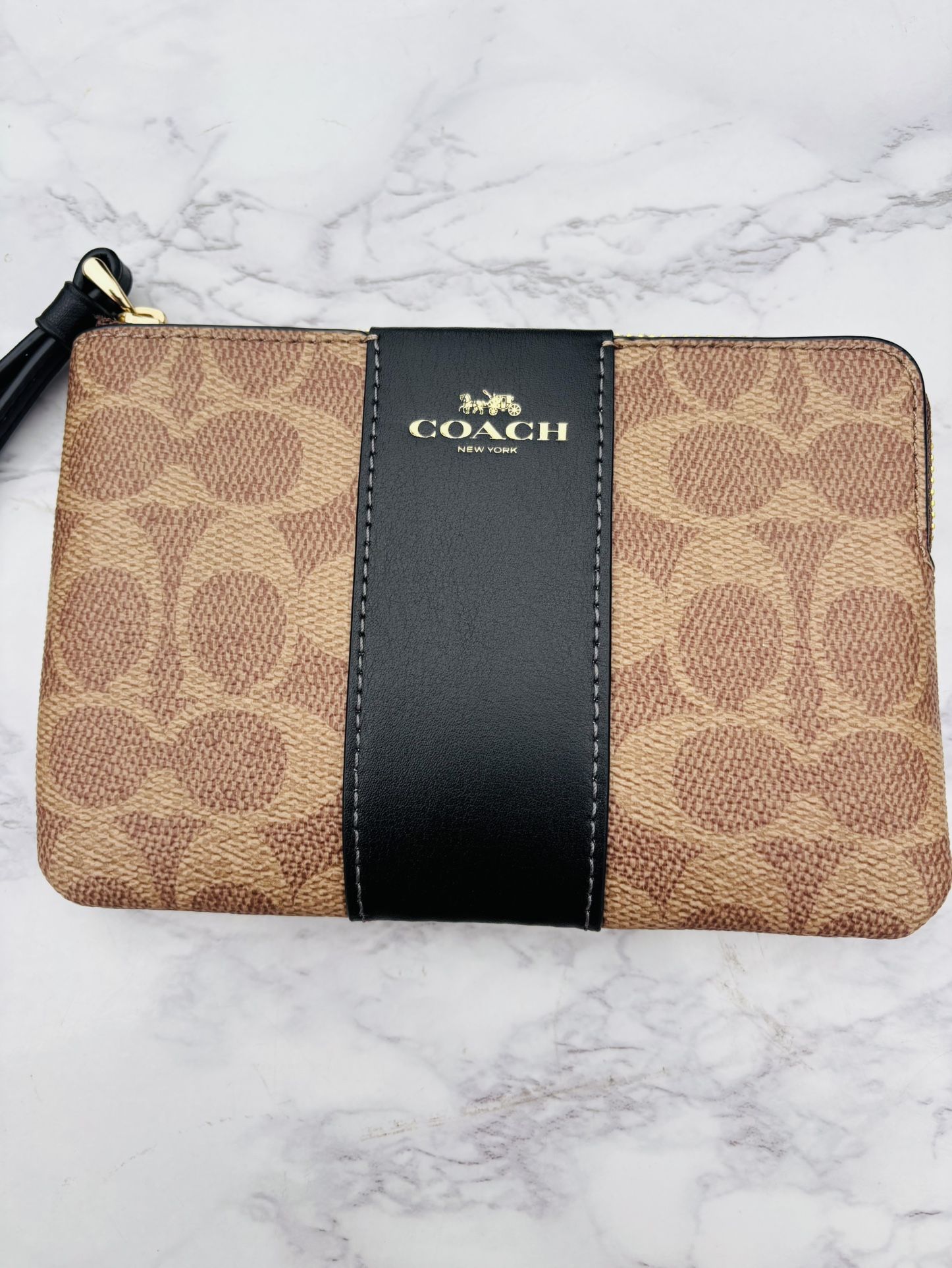 This Coach wristlet is a stylish and compact accessory perfect for any occasion. With a brown signature print and black leather accents, it is made of high-quality materials and features a fabric lining. The clutch is the perfect size for carrying your essentials. The wristlet is new with tags and comes from the Coach product line. The clutch is perfect for any outfit and can be used for a variety of occasions.