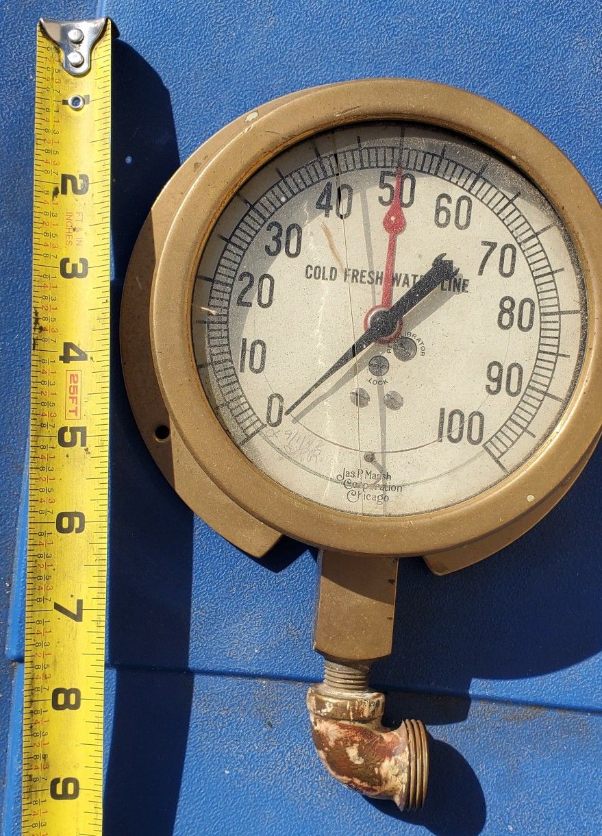 Old vintage water pressure gage glass is cracked made of brass or bronze.