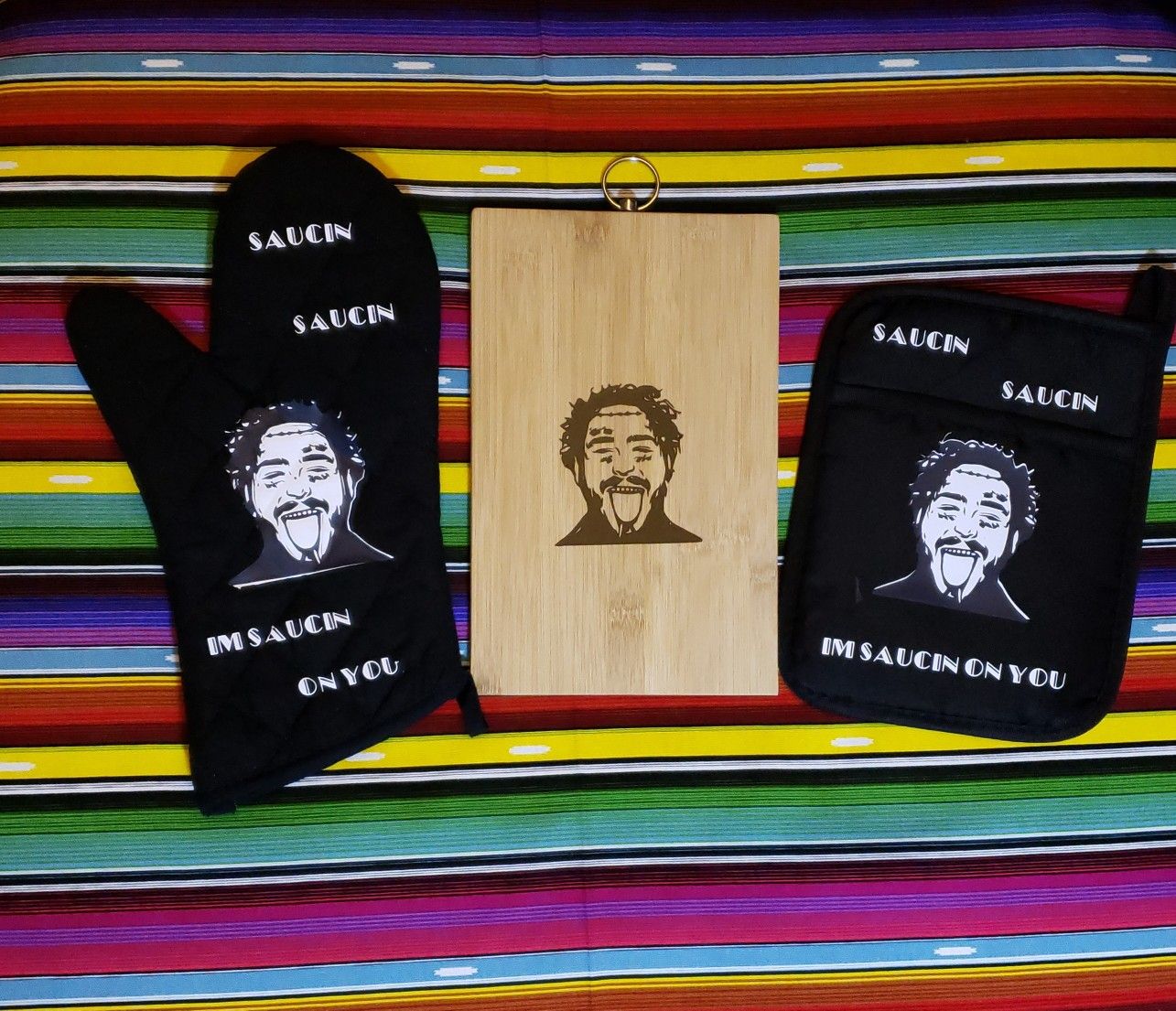 1 oven mitt 1 pot holder 1 small kitchen cutting board Personalized to your liking! Asking $20 for set!