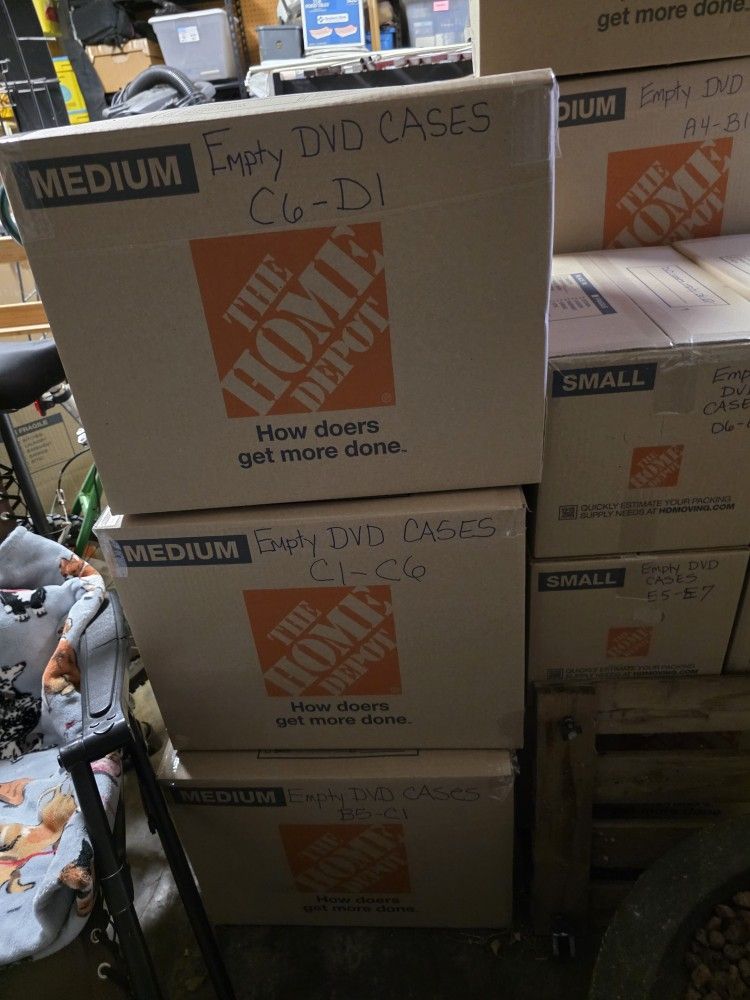 10 medium boxes and 4 small boxes with dvd cases only. No DVD's! There are about 1600 cases with original inserts. I took out dvd's to organize in binders to keep, but need to get rid of the cases. Give me an offer for all of them. Some people use them to organize crafts. Hopefully someone can use them for something.