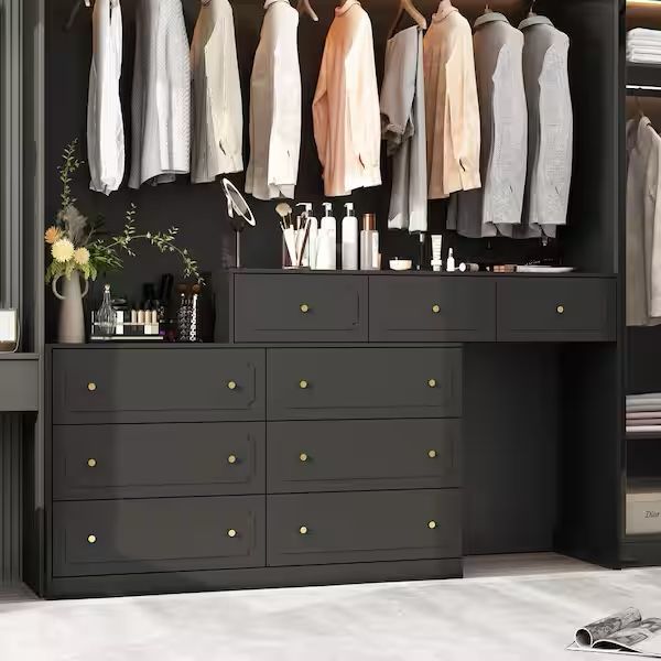9-Drawer 47.2 in. W Retractable Dresser Makeup Vanity Desk Bedroom Storage Organizer in Black with Rotatable Table
