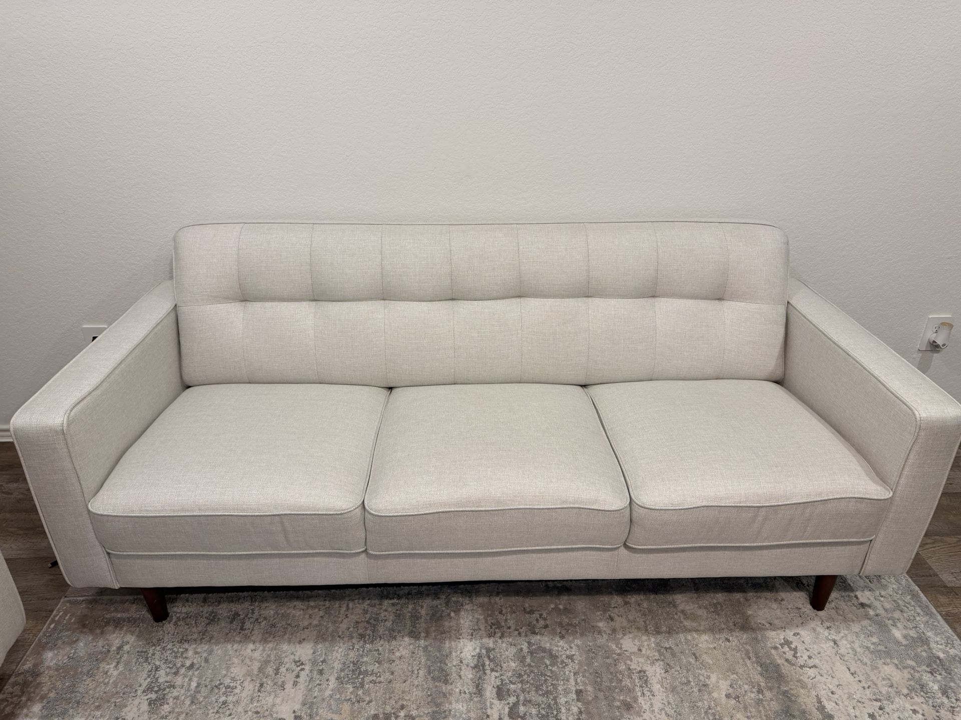 Stylish and comfortable sofa and loveseat set in a beautiful light beige/cream fabric. Features clean lines, tufted back cushions, and sturdy wooden legs—perfect for a modern or contemporary living room. Both pieces are well maintained, clean, and gently used. Very comfortable seating with firm cushions that hold their shape well. Details: • Includes: 1 sofa + 1 loveseat • Color: Light beige / cream • Fabric upholstery • Tufted back design • Condition: Excellent / Like new Great for apartments, homes, or office spaces. Reason for selling: Moving / upgrading furniture
