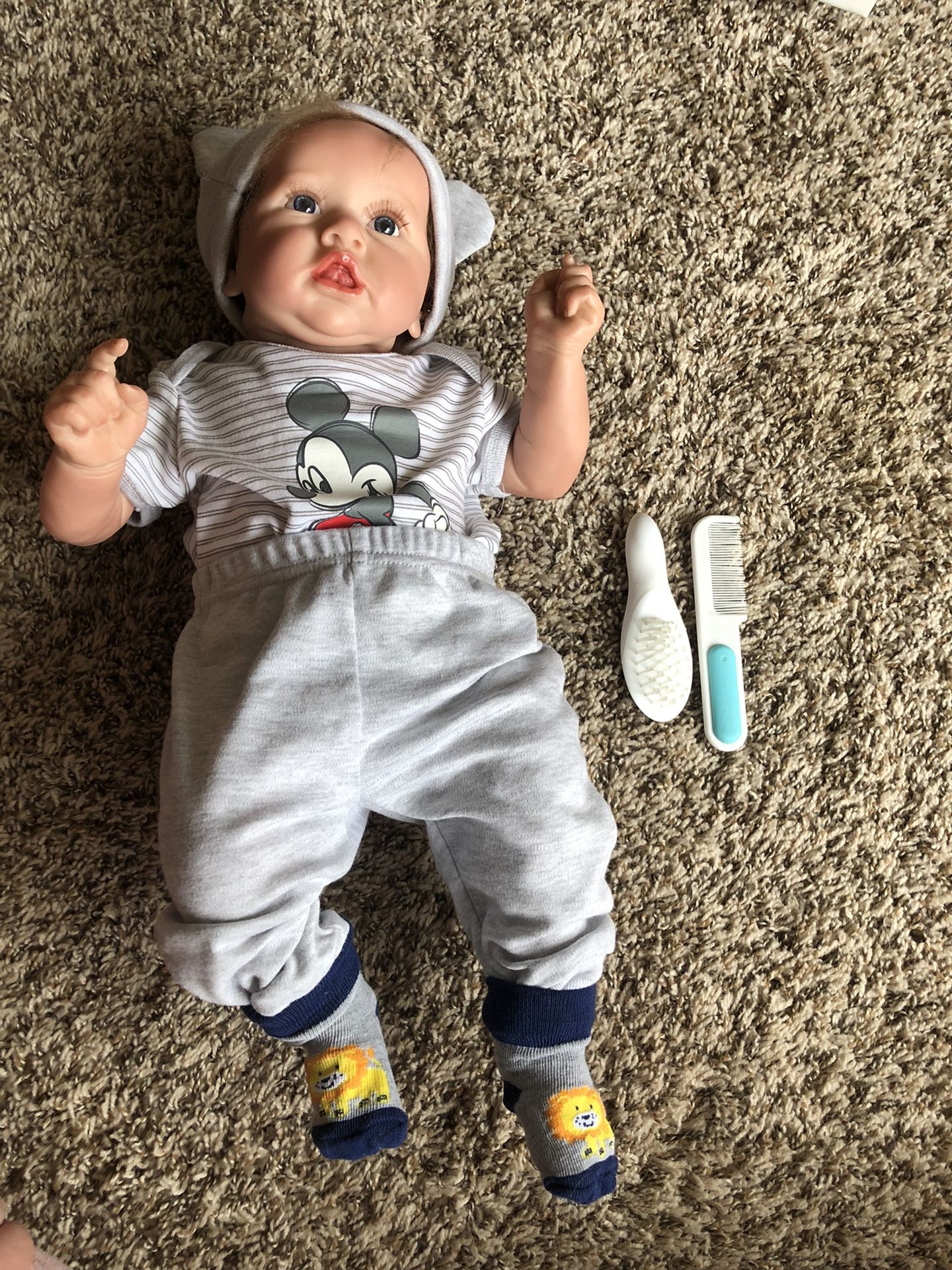 Good condtion, there is a mark on the arm as shown. Price reduction I’m fairly certain this is a reborn doll but I do not have proof of authenticity. It does have an artist marking on the neck and each limb. Acrylic blue eyes, fine stitched hair (strawberry blonde color), mottling and veins on the whole body, finger nails tipped in white, poly filled cotton body. Comes with new 0/3 month outfit, but could easily fit into newborn clothes. And baby hair brush and comb Mouth is also magnetic, so could be used with special magnetic baby doll pacifiers and bottles About 20.5 inches long, and I’d say weight is about 7-8lbs. Price obo **even if not a reborn doll, it a high quality, beautiful realistic doll