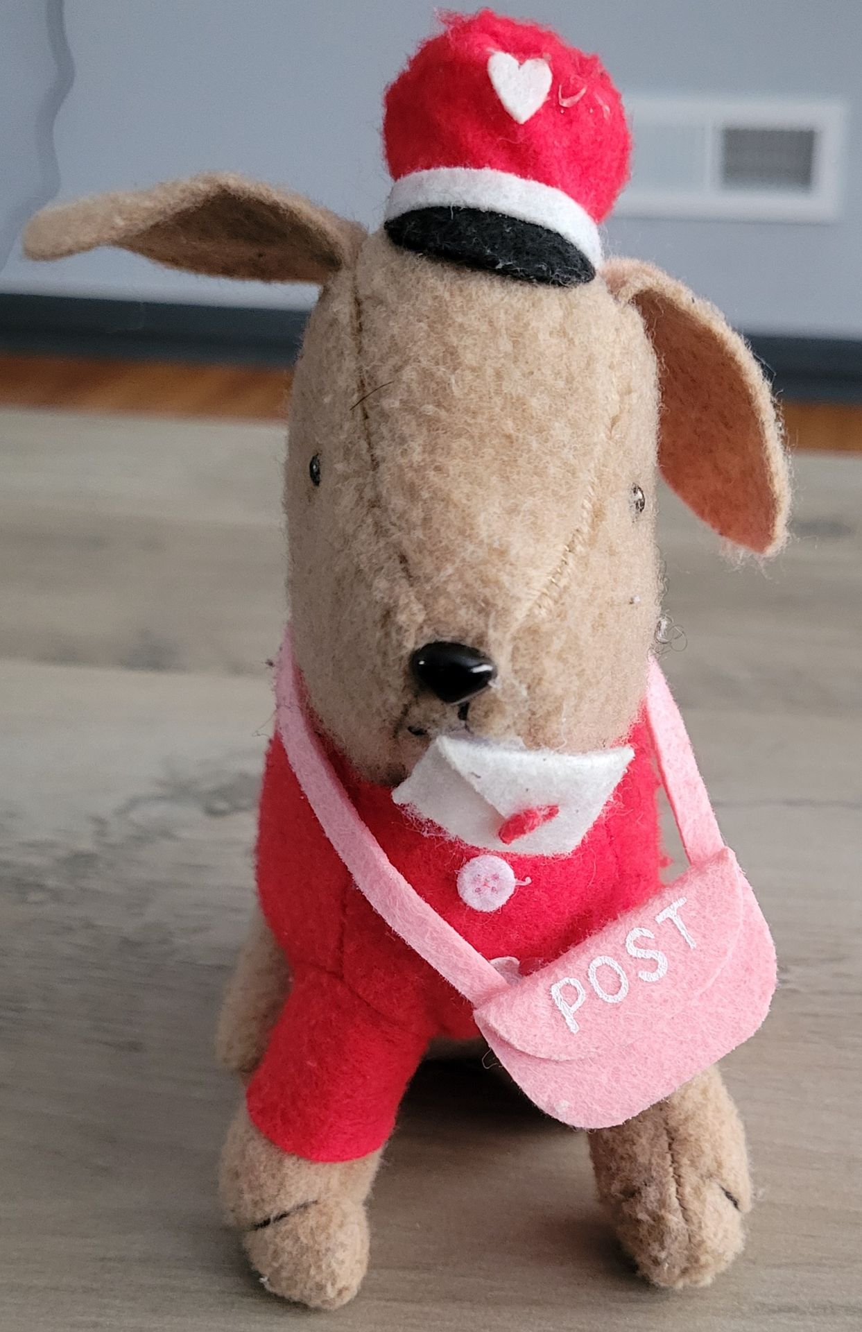 Postal dog plush toy from Target Bullseye Playground Valentine's Day collection. The brown dog is wearing a red postal uniform with a matching hat and a pink mailbag that says "POST".