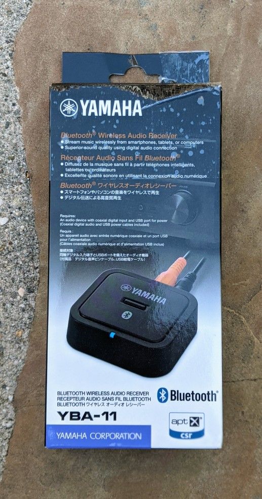 New in open box, Yamaha YBA-11 Bluetooth adapter for Yamaha AV receivers is available for sale complete with cords and user manual. With the YBA-11, you'll be able to stream music wirelessly from a BLUETOOTH capable smartphone, tablet or computer to the AV receiver. Enjoy music stored on your devices without the need for a Wi-Fi environment. Thanks to the digital connection and aptX audio coding algorithm, you'll enjoy wireless music streaming with optimum sound quality. • Stream music wirelessly from smartphones, tablets or computers • Superior sound quality using a digital audio connection aptX audio coding algorithm for better sound quality • Easy pairing with a Bluetooth capable device Bluetooth Adapter for Wireless Music Streaming: With the YBA-11, you'll be able to stream music wirelessly from a Bluetooth capable smartphone, tablet or computer to the AV receiver. Enjoy music stored on your devices without the need for a Wi-Fi environment. Thanks to the digital connection and aptX audio coding algorithm, you'll enjoy wireless music streaming with optimum sound quality. Dimensions • 2-5/8" × 7/8" × 2-5/8“ • 1.4 oz Compatible Models: HTR-4066 TSR-6750WA RX-S600 RX-V475, RX-V575, RX-V675, RX-V775WA YHT-599U, YHT-699U, YHT-799U, YHT-899U RX-A730, RX-A830, RX-A1030, RX-A2030, RX-A3030 R-N500 CX-A5000 MCR-N560 CRX-N560 Thanks for looking :-)
