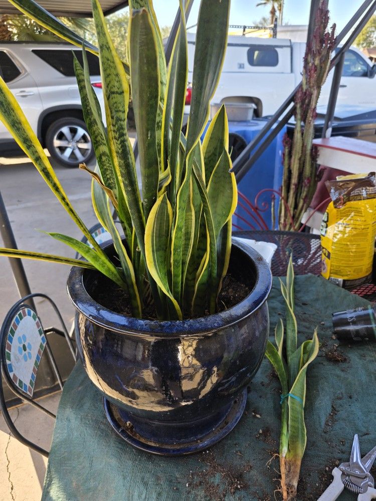Selling snake plant clippings . Repotted my snake plant into different pot. Plant is very healthy and had it for several years.. selling 2 healthy clippings together $15. When ready for pick up will re-pot with new soil and fertilizer. ( OR SELL POT AND PLANTS TOGETHER $100. THIS WOULD BE THE LAST PICTURE ) < in glazed drip pot > Thank you.