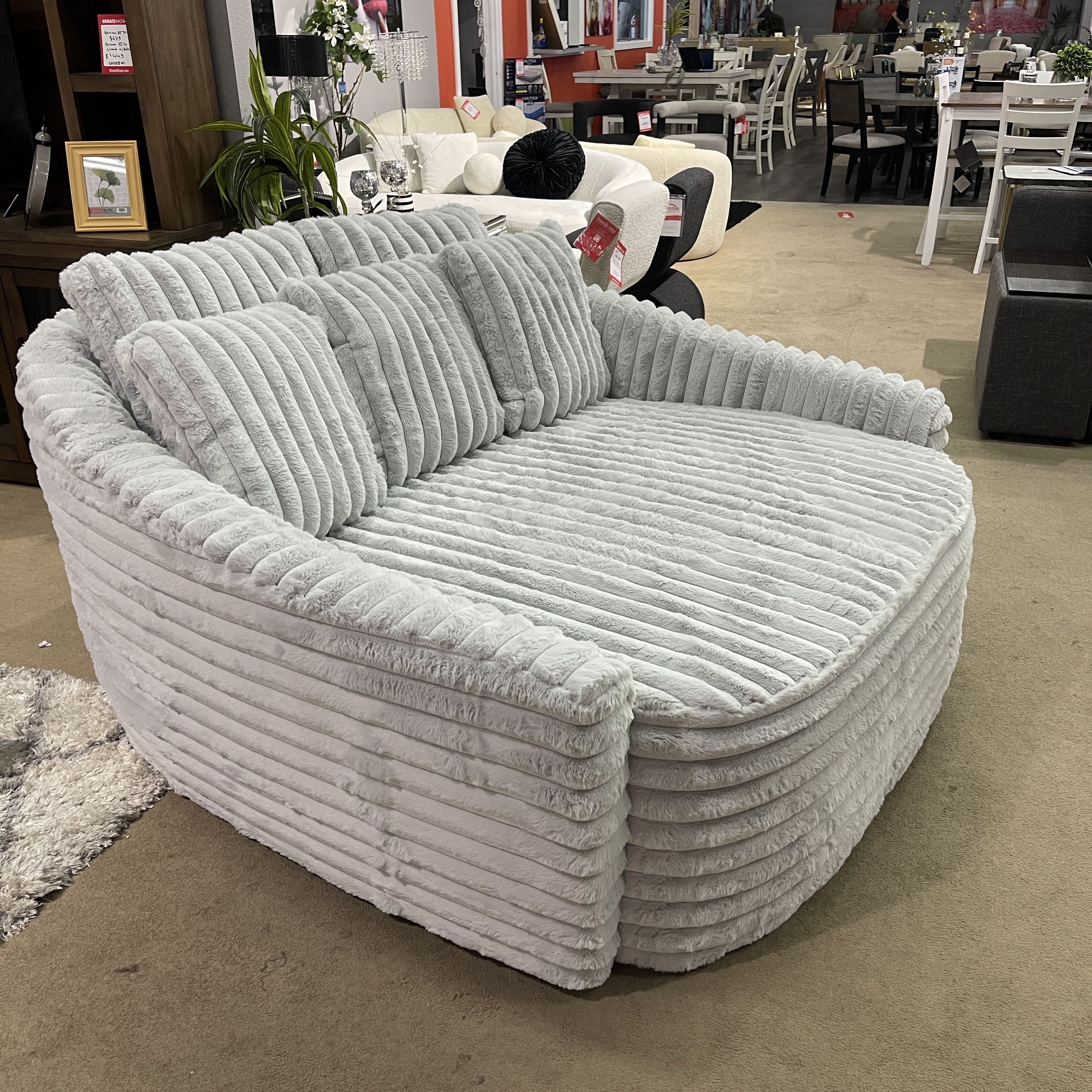 Chaise Lounge: 65" x 63" x 34"H Soft jumbo corduroy upholstery Pillows included Come visit our showroom at 2235 N Tustin Ave. Santa Ana or 13000 Firestone Blvd. Santa Fe Springs or shop online at ornatehome.com Enjoy unlimited item delivery for only $99 Explore our wide range of furniture options, including dining room sets, bedroom furniture, sectionals, sofas, recliners, sleeper sofas, rugs, wall art, mattresses, bedding, kids' room furniture, office furniture, vanities, bookcases, and much more. We proudly carry brands such as Ashley Furniture, Tempur-Pedic, Sealy, and Stearns & Foster.