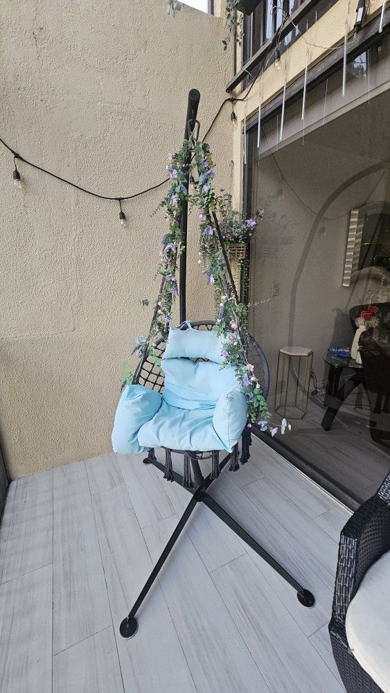 Create the ultimate relaxation spot with this stylish Bohemian hanging chair. Featuring a beautiful hand-woven macrame design and a sturdy black steel stand, it’s perfect for both indoor and outdoor covered use. CASH ONLY! [IMPORTANT PICKUP DETAILS] This item is sturdy and relatively heavy. Please bring a truck or a large SUV/Van and at least one person to help you load it. I am unable to assist with lifting or transport.