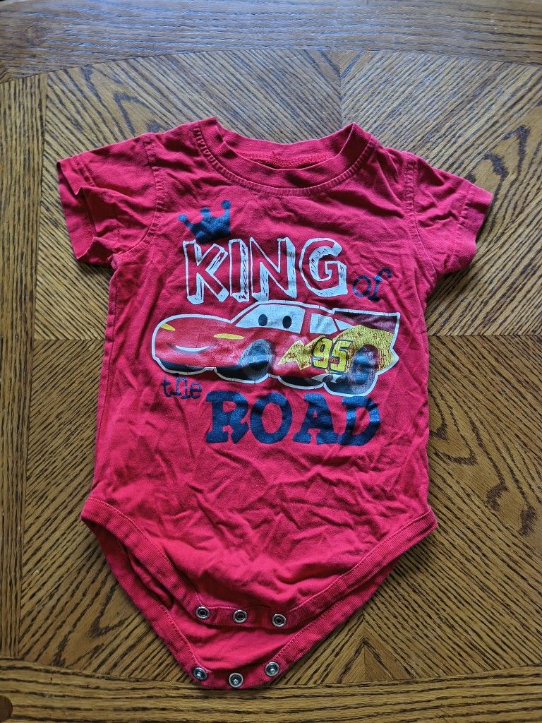 This listing is for a gently used red Disney "Cars" onesie featuring a graphic of the character Lightning McQueen. The fabric is a comfortable cotton blend (estimated), and the item has a full snap closure for easy changing. Please note that the brand and size tag are missing, so please refer to the provided measurements. The item is in great, pre-owned condition with no stains or tears.