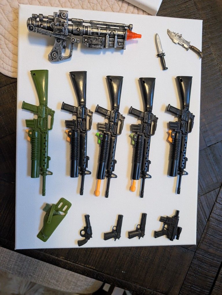 GI Joe 1:6 guns sold as a lot. Includes all pieces guns, knives and holsters as shown. Over 100 pieces in total. OBO.