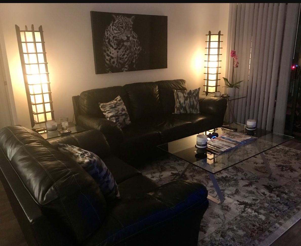 (2) glass end tables (1) glass coffee table Love seat and Couch