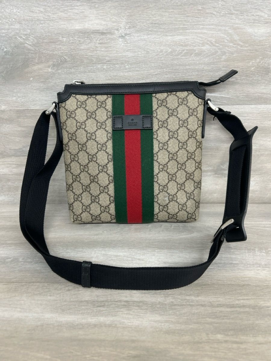Available now at Pawn Central - Gucci Ophidia GG Supreme Messenger Bag in signature monogram canvas with brown leather trim and green-red web stripe. Measures 12" W x 10" H x 1.5" D. Adjustable strap, zip closure, clean interior. No dust bag or box. Entrupy authentication certificate included. Please feel free to message if you have any questions. At Pawn Central, we offer authentication of luxury watches and designer items, We offer layaway payment plans that are interest free. We also provide 90-day collateral loans.