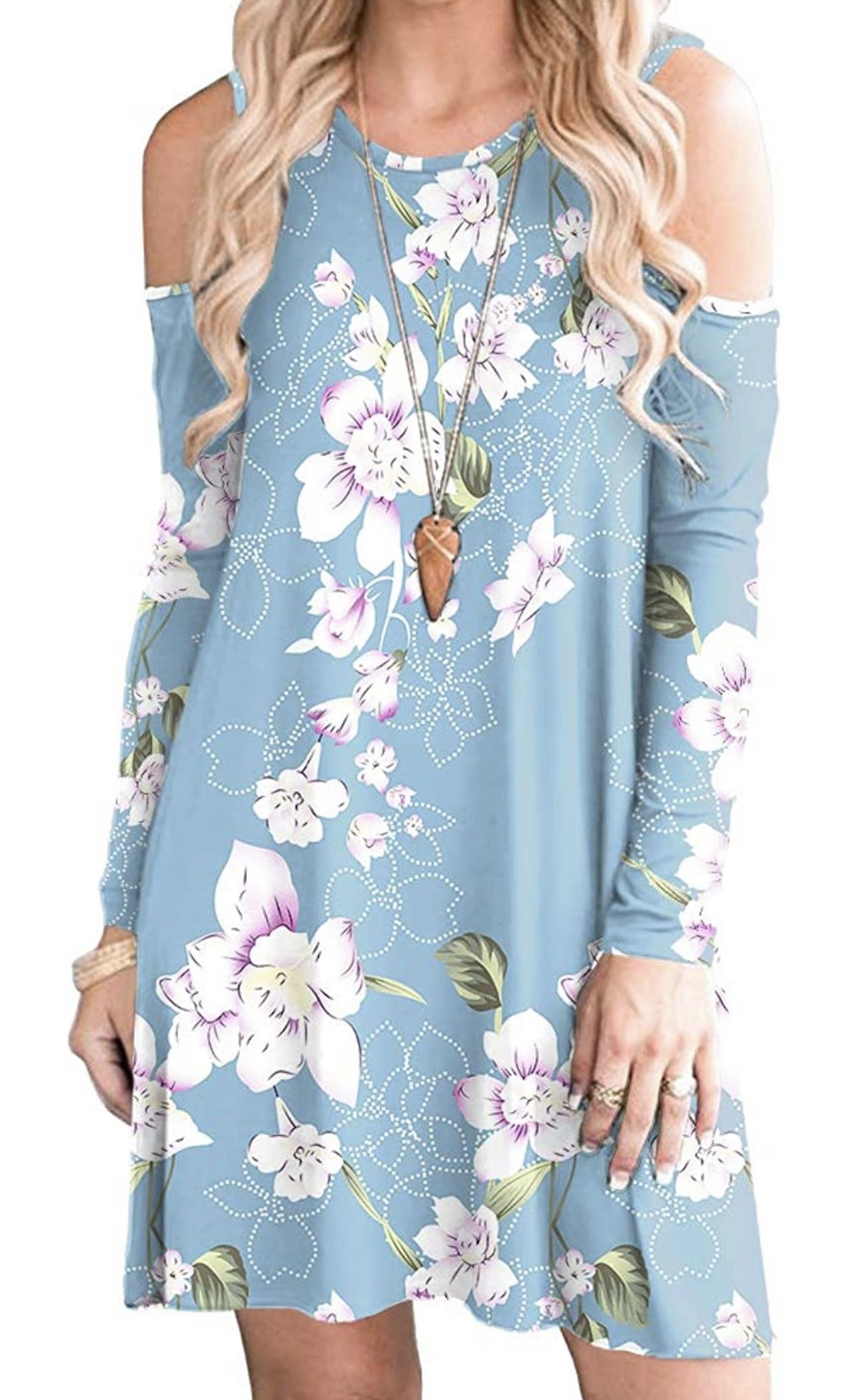 Women's Short Sleeve Cold Shoulder Tunic Top Swing T-Shirt Loose Dress with Pockets Small , Long Sleeve-fp- Light Blue