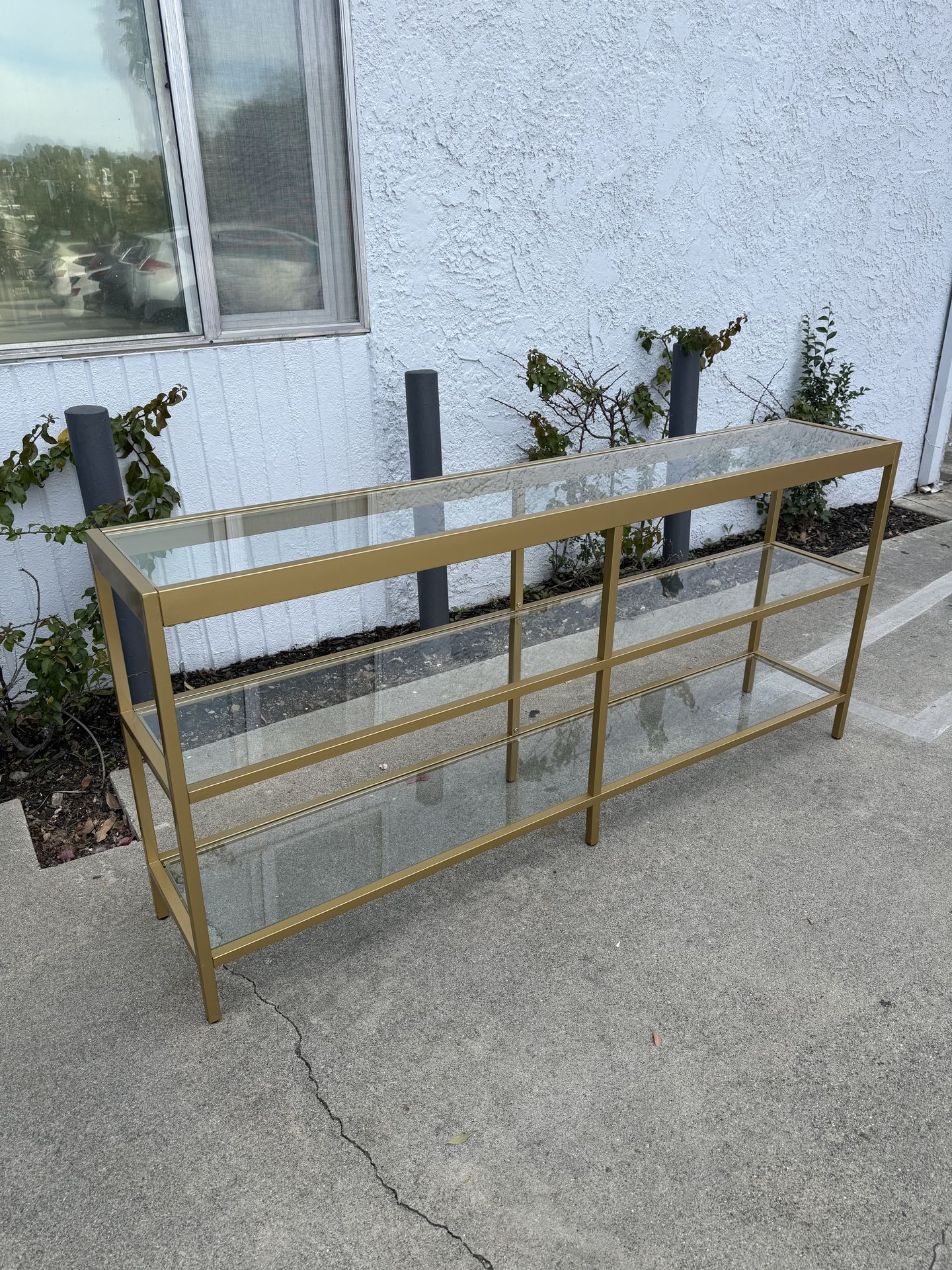 Good condition and very solid! Multi-use. Size: 29.5" H x 64" W x 12" D This console table streamlines your space with an extra surface and a clean, glam look. It's crafted from stainless steel with a rectangular frame with six support legs in an open work style and a smooth solid finish. The design features three tiers of transparent tempered glass shelves - we love that it gives any décor you arrange an airy, floating effect. Plus, this sofa table's wide but shallow construction offers storage without crowding your floor space.
