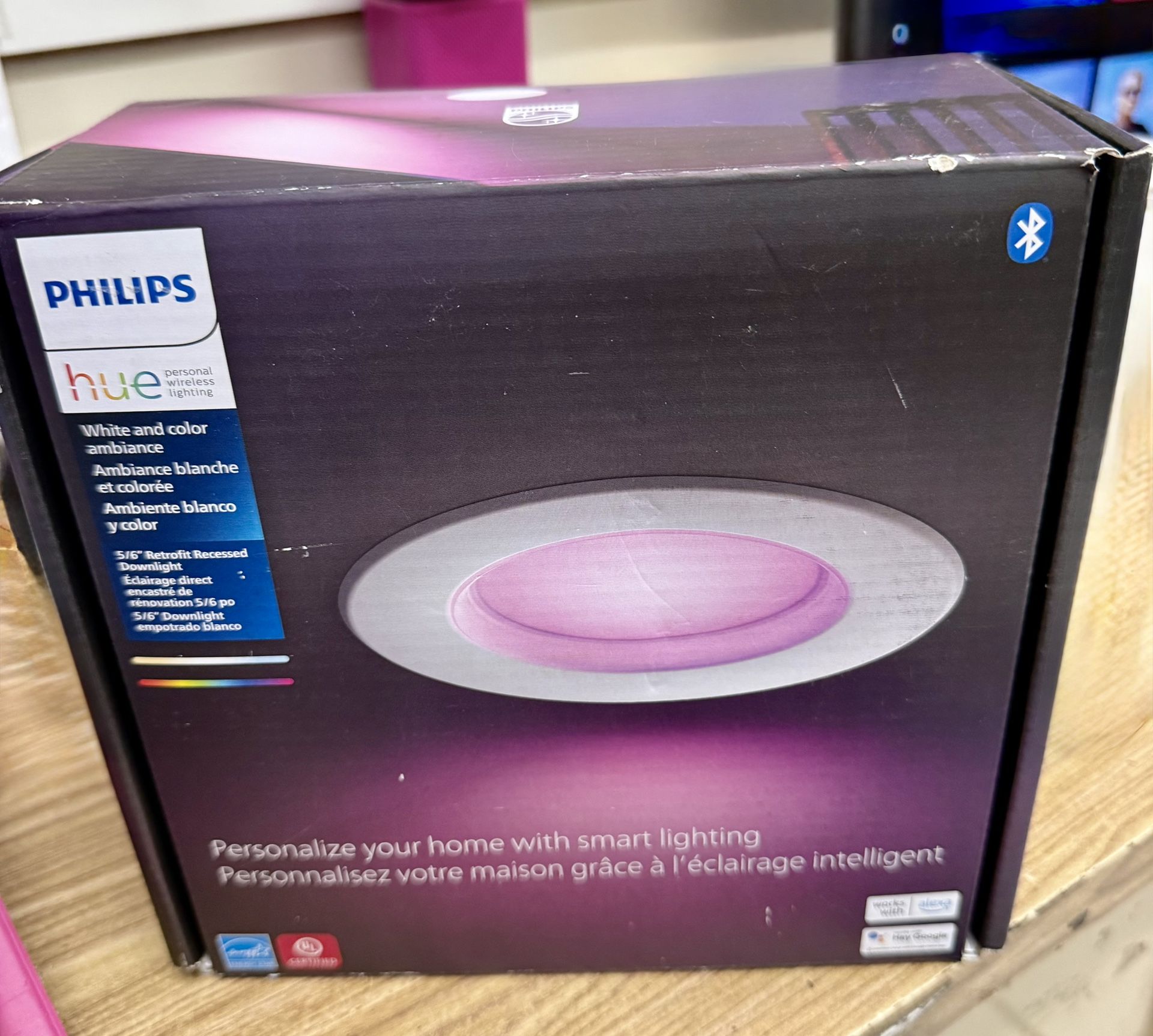 Open box - small scratch on white outside rim - see pictures Item - 8450 LED Works with Alexa Hey google Personal wireless lighting Retrofit 5 or 6 inch downlight 1100 lumen @ 4000K 12W E26, 2000K - 6500K 120Vac 60Hz