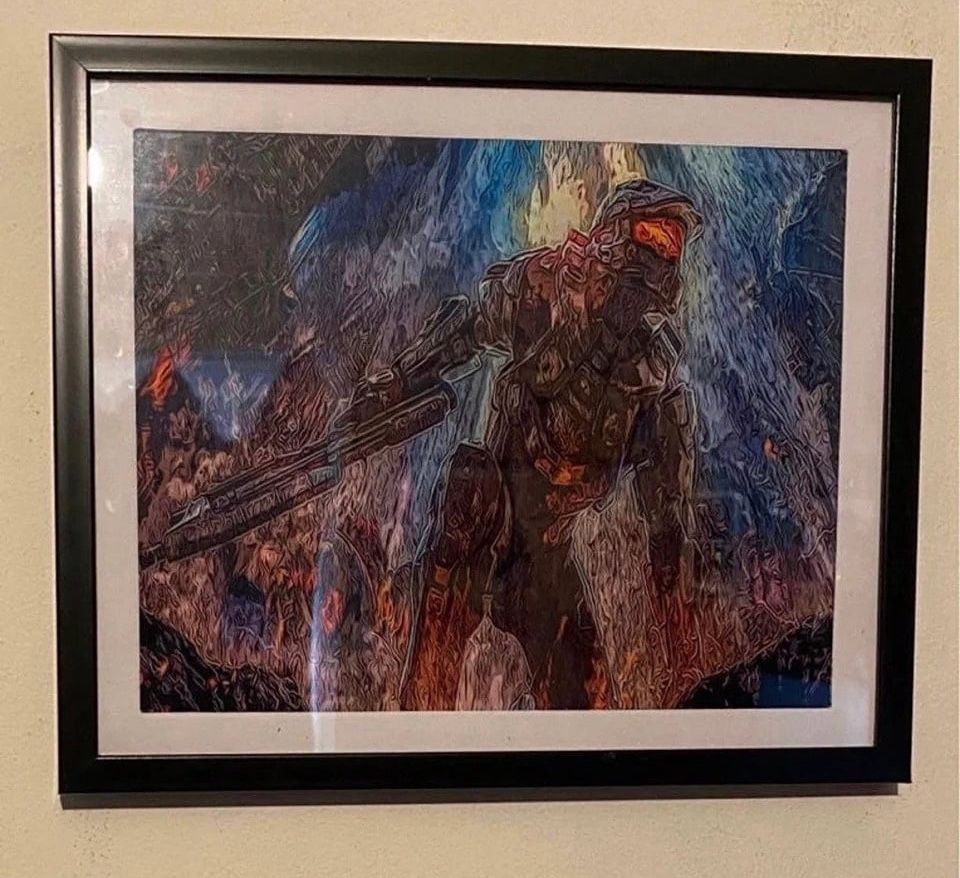 Step into the universe of epic battles with this custom art piece featuring the legendary Master Chief from the Halo franchise. Showcasing the iconic Spartan in his powerful armor, this artwork captures him in a dynamic pose, ready for action. Professionally framed in a sleek 12x10 black frame, this piece is perfect for enhancing any gaming room. Perfect Gift: Ideal for any Halo fan or collector, this unique piece makes a memorable gift for any occasion. Larger Prints with Frames & Original 1-of-1 Canvas Available: Want to make a bigger impact? Larger framed prints and exclusive original 1-of-1 canvas pieces are also available. Sci-fi, First-person shooter, Master Chief, Covenant, Spartan, War, Aliens, Halo rings, Multiplayer, Xbox, Cortana, Flood, Battle, Armor, Energy sword, Halo: Combat Evolved, Halo 2, Halo 3, Halo 4, Halo 5: Guardians, Halo Infinite, Campaign, Xbox Live, Forge, Grunt, Elite, Warthog, Prometheans, Covenant