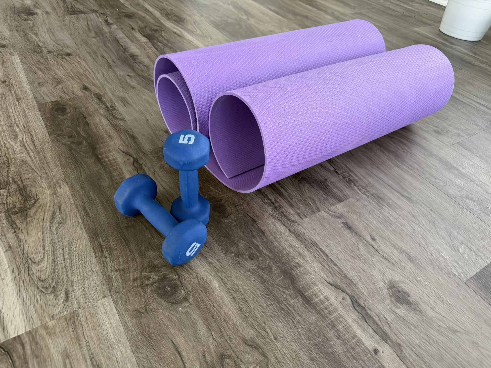 Title: Yoga Mat + 5 lb Dumbbell Weights – Home Workout Set Price: $15 Description: Selling a yoga mat along with 5 lb dumbbell weights. Great starter set for home workouts, stretching, yoga, or light strength training. - Comfortable yoga mat - 5 lb dumbbells (pair or single if applicable) - Good condition, lightly used - Perfect for beginners or home fitness Only selling because we are moving. Message if interested on (contact info removed)