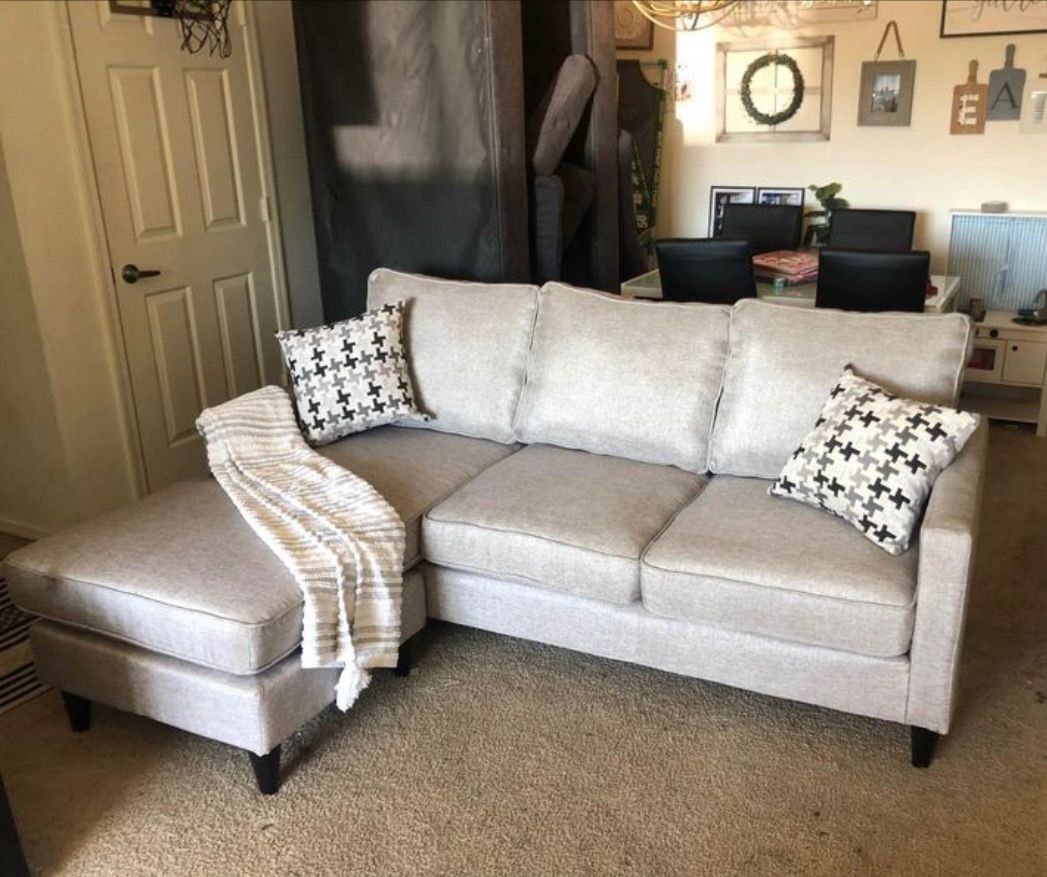 Excellent Shape. Original Condition. Nori Model by Picket House Furnishings. $900+ Retail Comfortable Cushions, Smooth Fabric, Reversible Chaise, Clean. Dimensions: 80in Long, 35in Deep, 30in Tall, 59in Chaise, 18in Seat. Pickup in 92139 & Delivery Available.