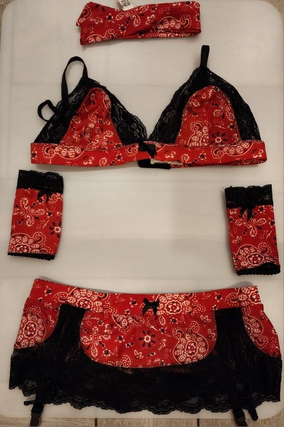 Forplay Sexy Cowgirl Costume Size: M/L (runs more like a small) Complete set includes: top, garter skirt, fingerless gloves accessory & neck bandana-like accessory No tags, but the costume has never been worn.