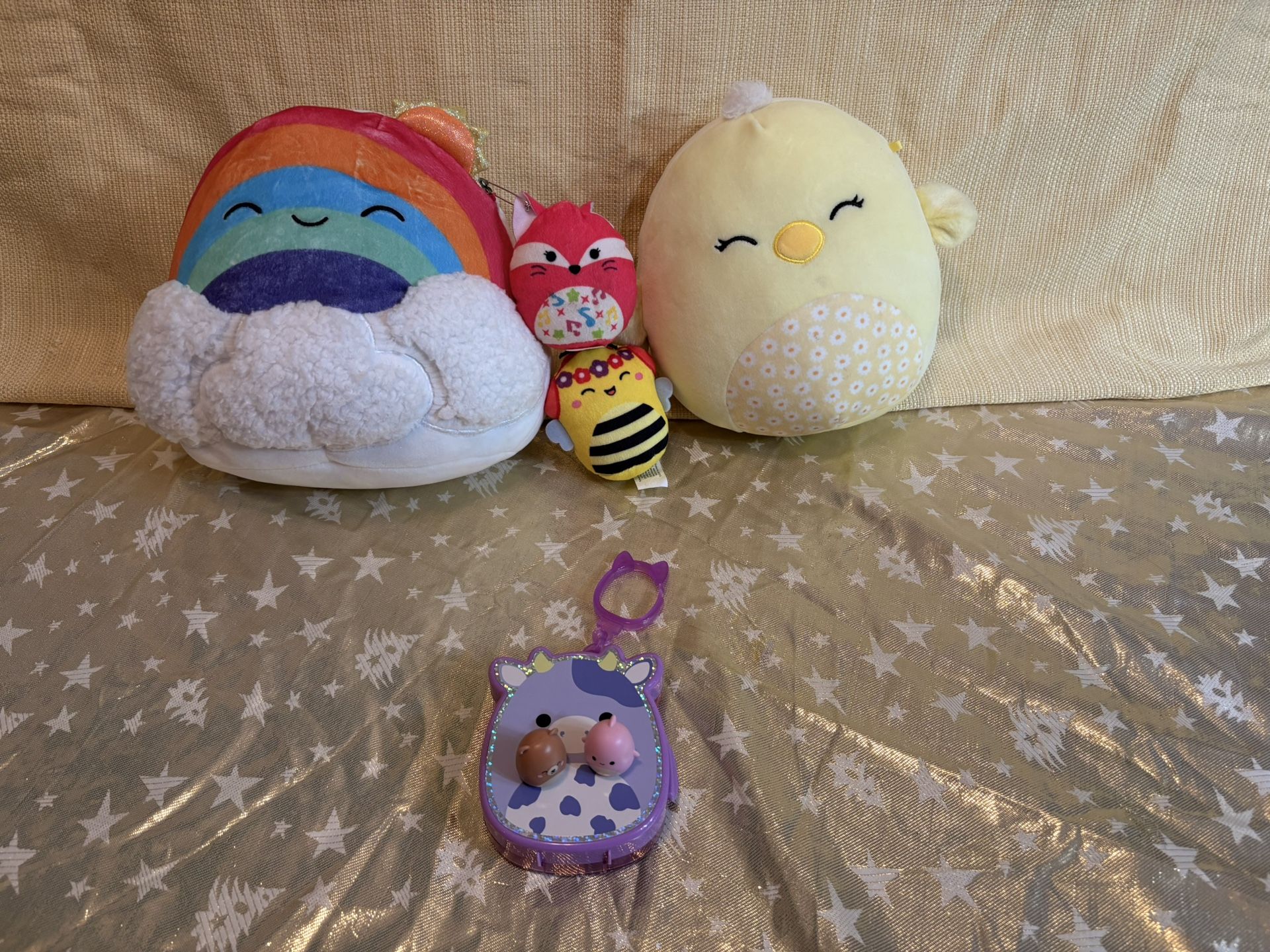 Last minute Christmas items-two squishmallows with a little friend! 1. Medium sized Aimee the yellow chick has a floral belly. Measures 8”. Comes with a mini squishmallow, Sunny the Bee!-both $8 2. Medium sized Belina the Rainbow Cloud. Measures 14”. Comes with miniature Fifi the Fox!-both $10 3. -This is a Squish-a-longs Bubba Clip & Go case, which includes the Bubba the Cow clip case and mini-squish toys.- $4 All are next to new. Smoke and pet free home! Cash or Venmo.