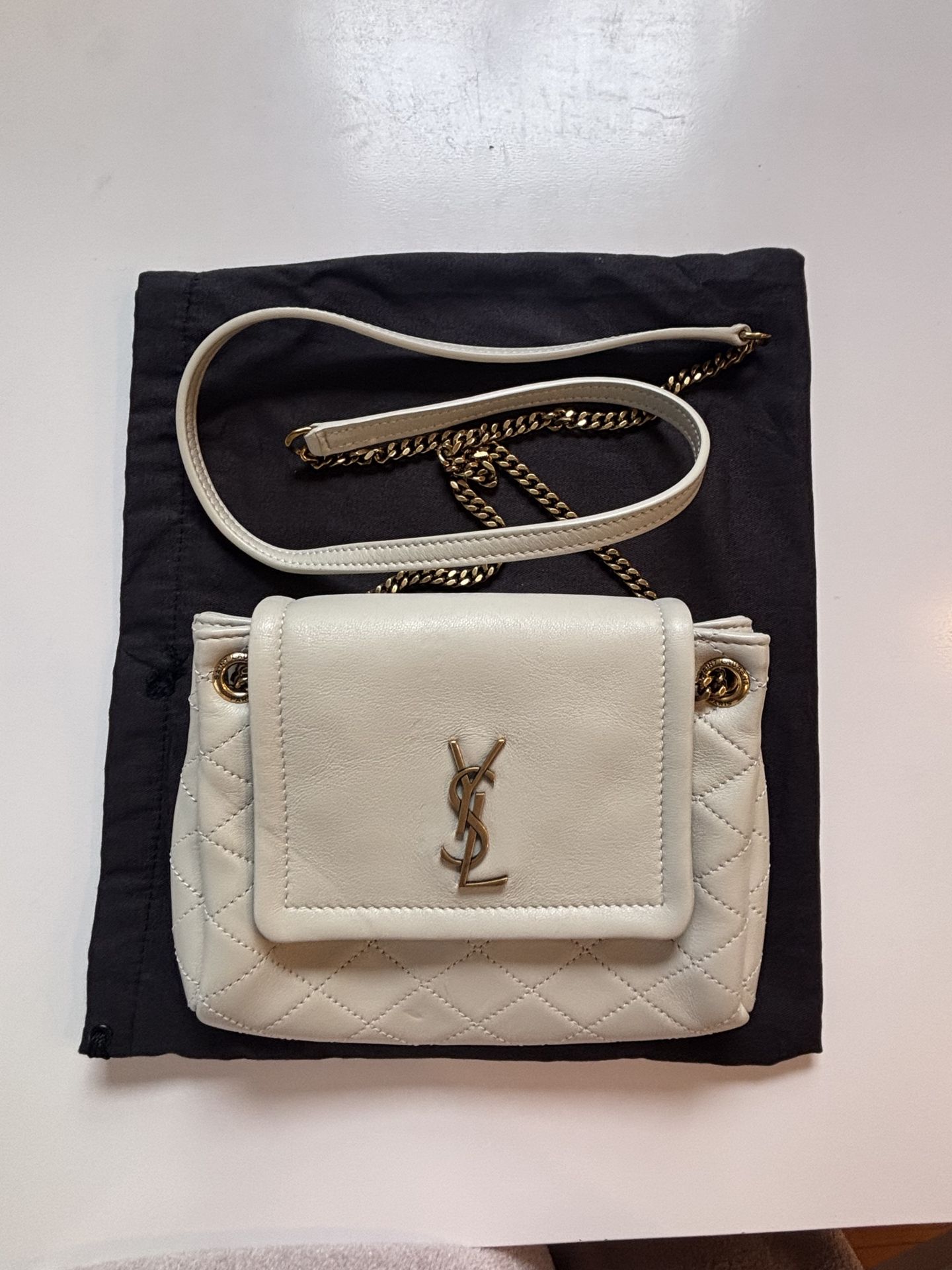 Yves Saint Laurent crossbody with quilted design. lamb skin leather (latte color/off white) Like new. Made in Italy 18x13x6 CM