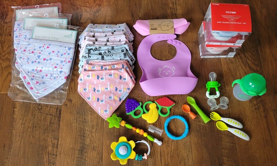 ●NEW Aden & Anais bandana bibs 2pack ×3, $20 for all 3 packs ●NEW Bebe Tales Bandana Bibs 4 designs, 3 each, $15 for all 12 bibs ●NEW Mama Bear sippy cup w/ weighted straw & straw cleaner $7 ●Like-NEW Monee brand Bowl & Spoon Set, travel-friendly $10/set 2 sets available: light blue, light pink ●Keababies Baby Silicone Bibs w/ wide pocket food catcher 1 NEW in seal package (pink Cotton Candy) $5 1 USED 3 times (lavender) $3 Gently used items: $12 for all -Bonbino Teether Ring $1 -Wimmzi Tutti Frutti Teether Toys $5 -Silicone teether w/ star clamp to attach onto clothing $2 -Beaba Spoon & Fork SET $1 -Baby fruit feeder w/ extra bulbs $2 -green silicone spoon $.50 -orange juice pack/puree feeder spoon $.50