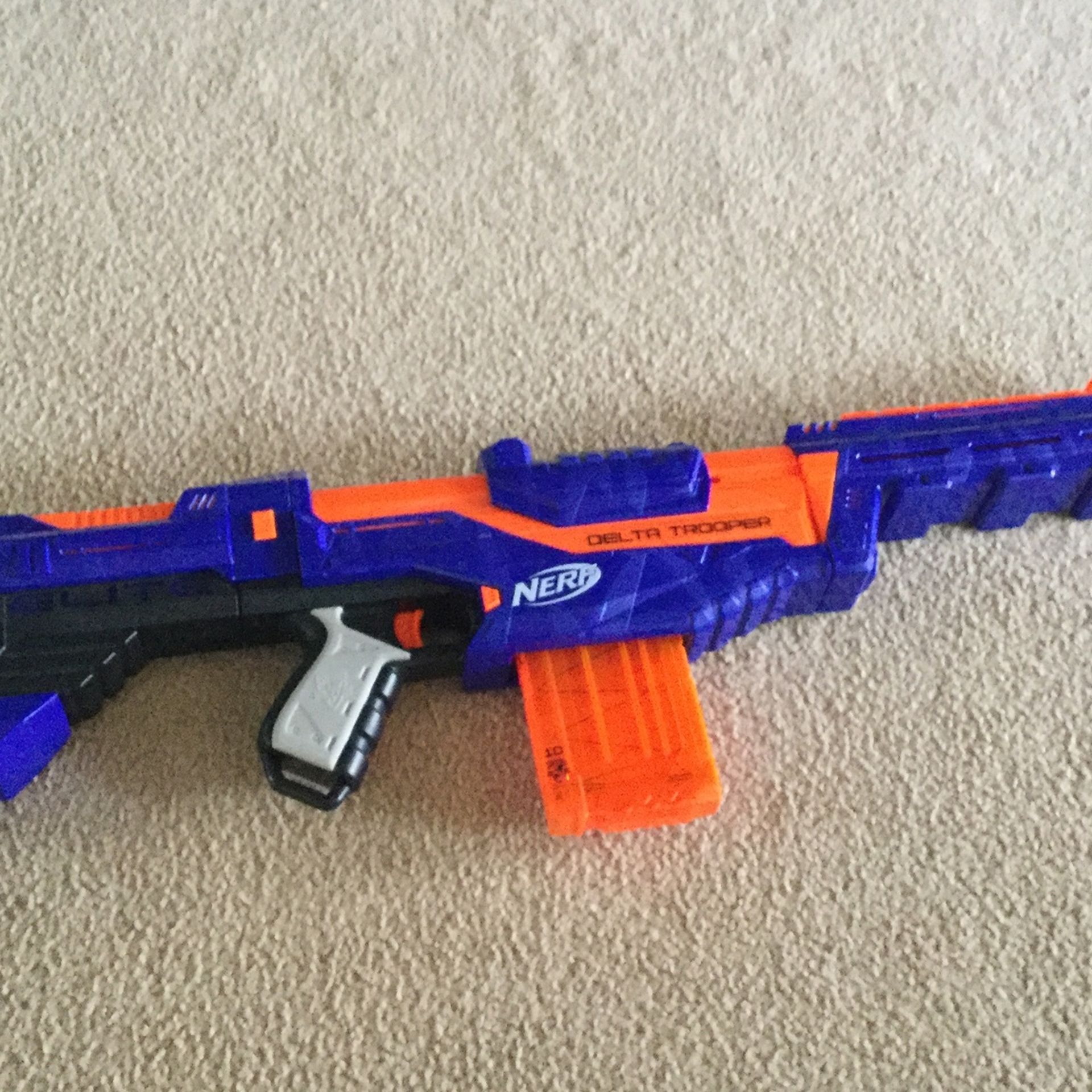 The nerf elite delta trooper is a top prime magazine fed single shot spring powered nerf blaster. It comes with 1 10 dart magazine, and has a removable hand used and stock.