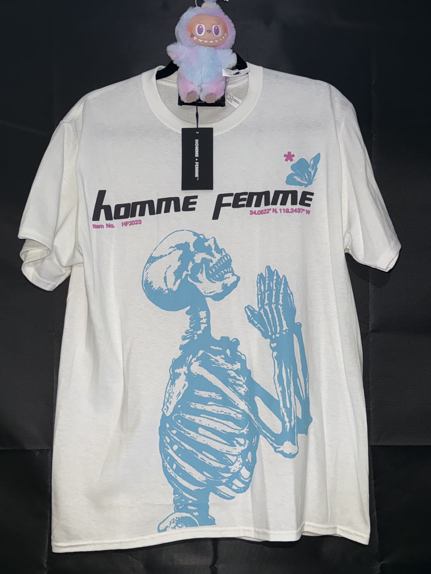 Hard-to-find piece from Homme + Femme – bold skeleton front & back graphic on a clean blue tee. Brand new with tags. Size M but fits slightly oversized (can work for a slim L too). Retail was $120 and it's sold out everywhere. Only one I’ve seen online is a 2XL going for $50 — this is the *only* Medium available right now. **My price: $50** Open to bundle deals – I got hoodies, tees, jeans, jackets, and more (all brand new). Bundle and I’ll give you the best price. 📦 Ready to meet or ship 🧼 Smoke-free, clean storage 💸 Cash, Zelle, Apple Pay, etc. DM if you’re interested or want to see what else I got.