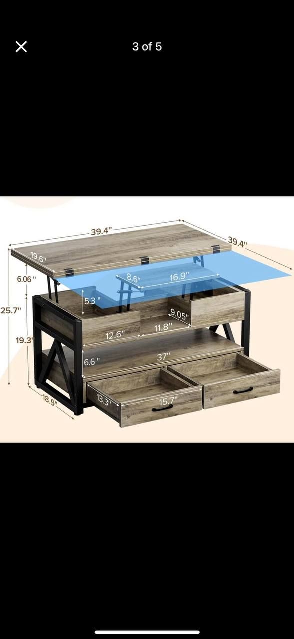Lift-top surface (great for working or eating) • Hidden storage under the top • Two bottom drawers for extra space • Rustic wood look with a strong black metal frame