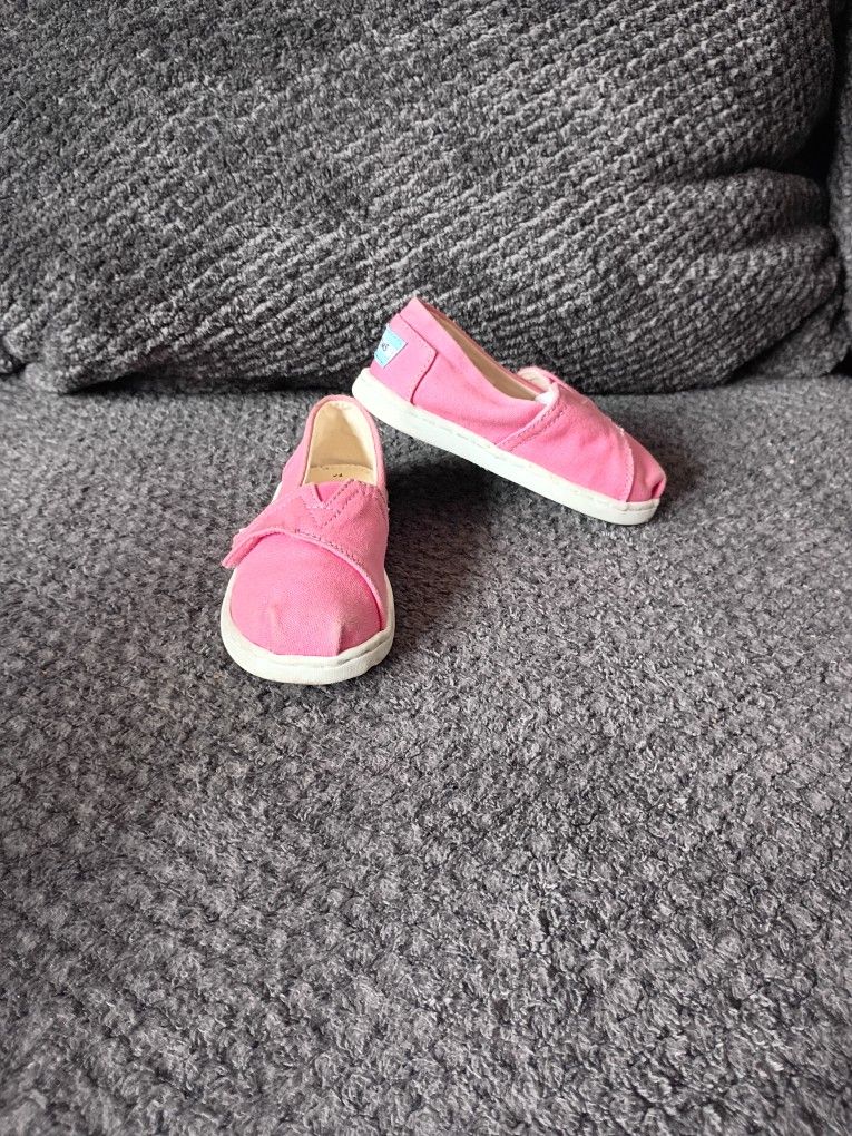 This pair of shoes is the TOMS Alpargata Tiny Classics in "Bubblegum Pink" for a toddler with no rips just minor signs of wear. Designed as a mini version of the brand's signature slip-on, these toddler shoes feature a vibrant pink canvas upper and a durable rubber outsole. For ease of use, they typically include an elastic "V" gore or a hook-and-loop closure to help with quick on-and-off. Material: Canvas upper with a lightweight, flexible TPR rubber outsole. Key Features: Vegan construction, built-in antimicrobial sock liner to fight bacteria, and cushioned CloudBound insoles for comfort during play. See pictures for more details