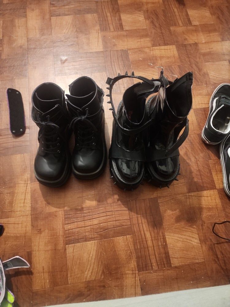 Both size 8 Have zippers on back of shoe Left boots- $15 used/wearable but damaged Inside of boot where back of heel rests is worn down if you wear heel bandages or thick socks not noticeable Right boots- $95 Brand new only wore once Has spiked details Customizable colors for boot you can take off straps, it's velcro Taking offers