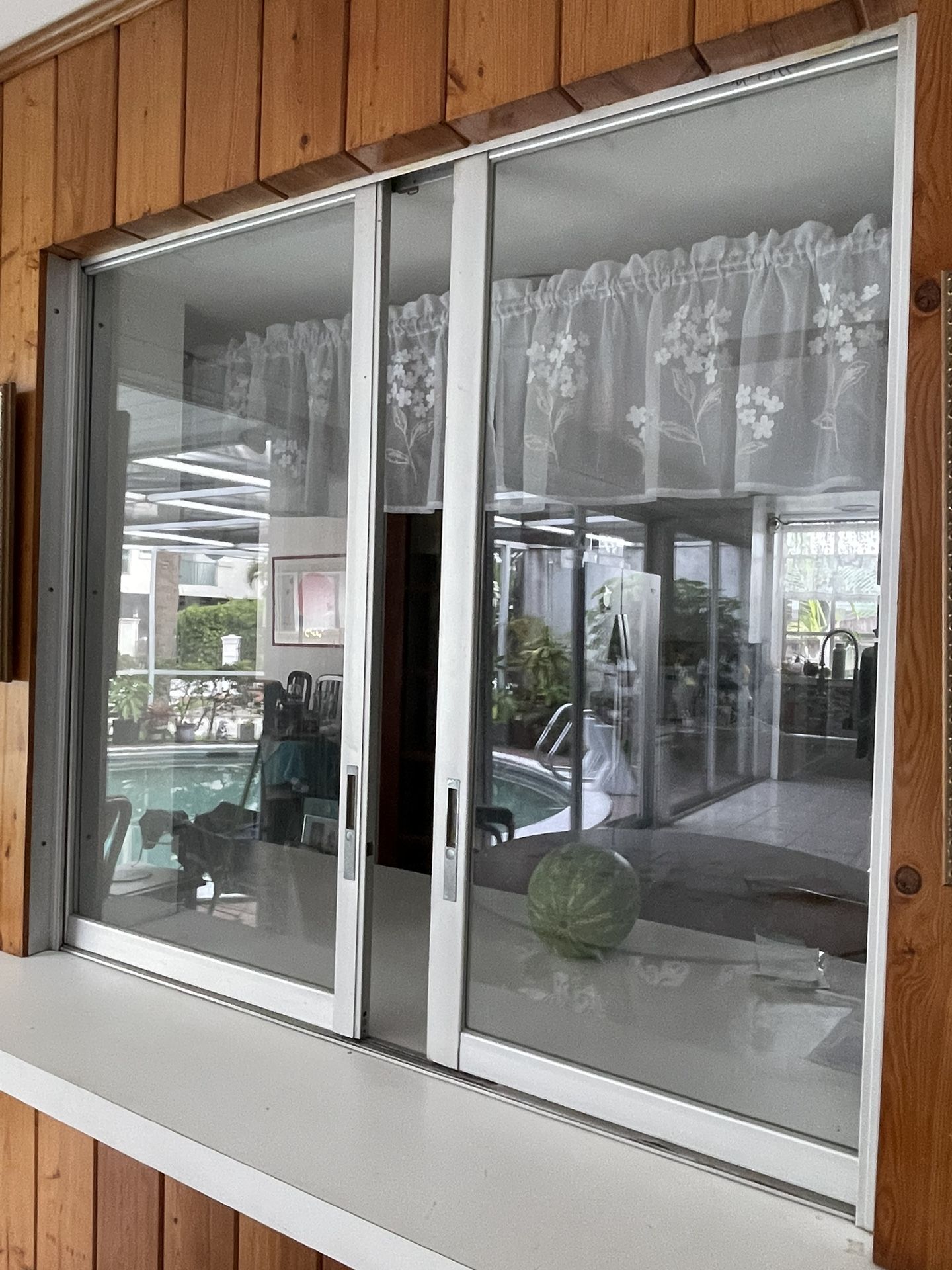 Two sliding aluminum thick glass windows Width 31 inches x height 541/2 inches (fifty four and a half)..