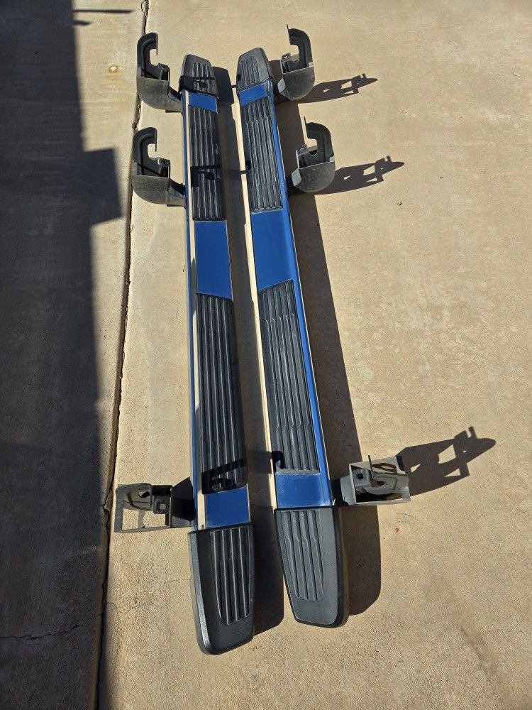 Running Boards off of a 2023 GMC HD 4x4 extended cable pickup. Good condition. 90 inches in length. Front bracket to middle bracket 21 3/4, front bracket to rear bracket 67 3/8