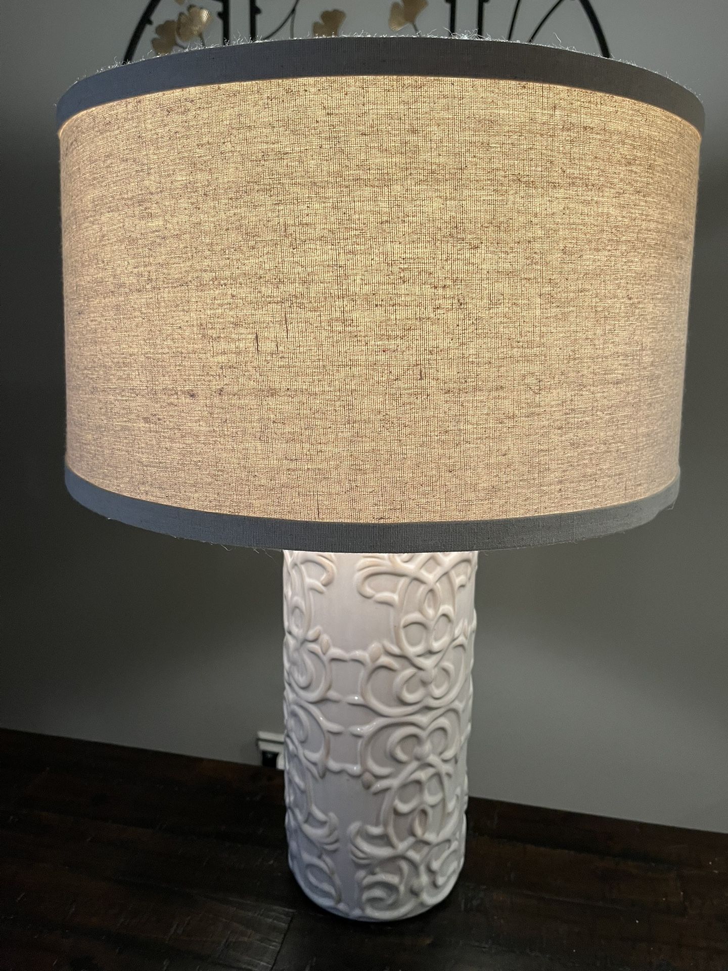 Large 17 inch shade on a ceramic base. No chips or damage to any part of the lamp. Comes with a warm white bulb.