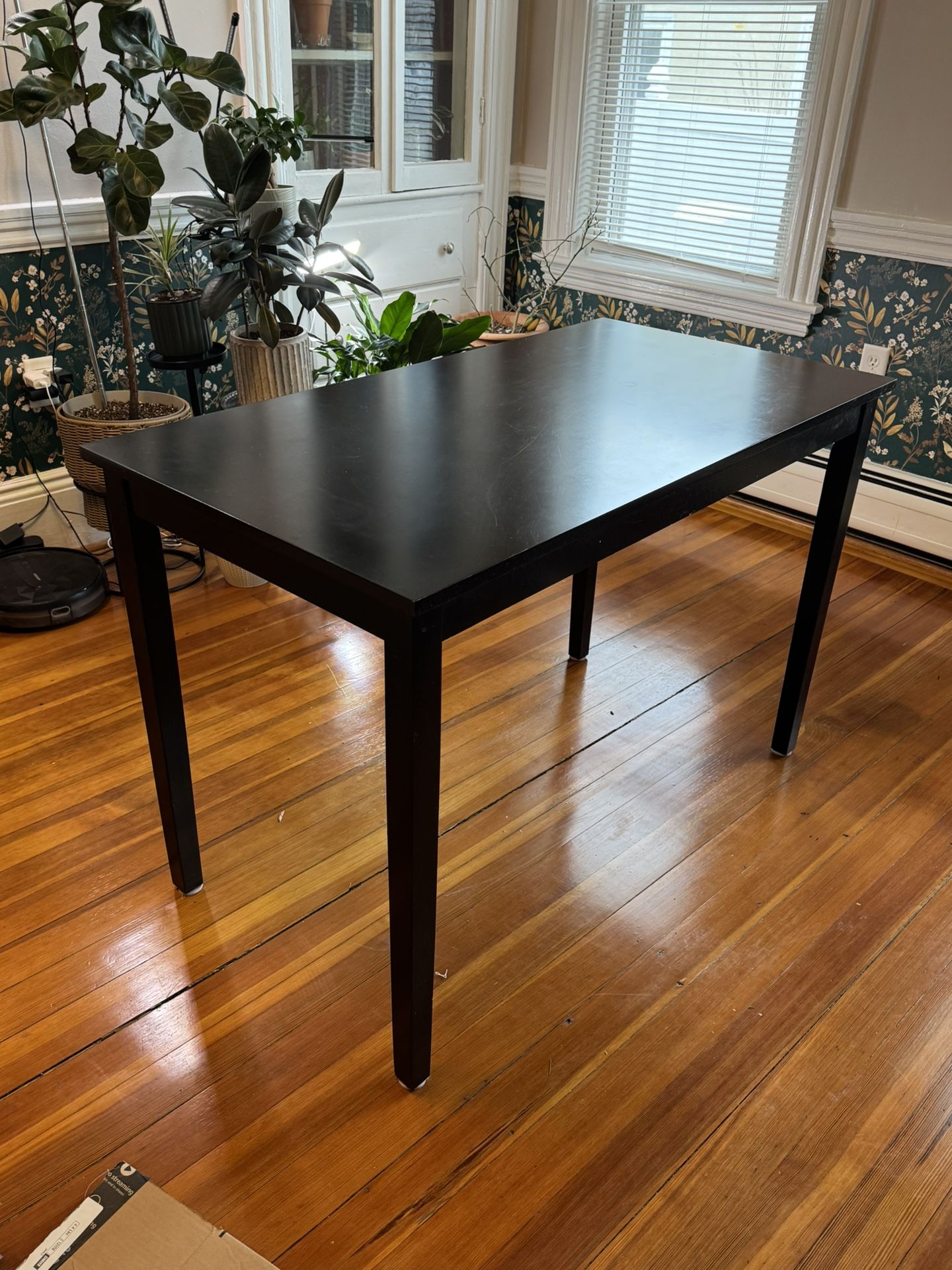 Rectangular dining set from Ashley Furniture. Used for about 2 years in a smoke-free home. • Table + 4 upholstered chairs (soft fabric) • Sturdy and functional • Great size for apartment or dining area • Dimensions: approx. 45” L x 24” W x 30” H This is a used table with visible surface scratches from normal use (shown in photos). Nothing structural — cosmetic wear only and priced accordingly. Pickup in Saugus. Cash or Venmo.