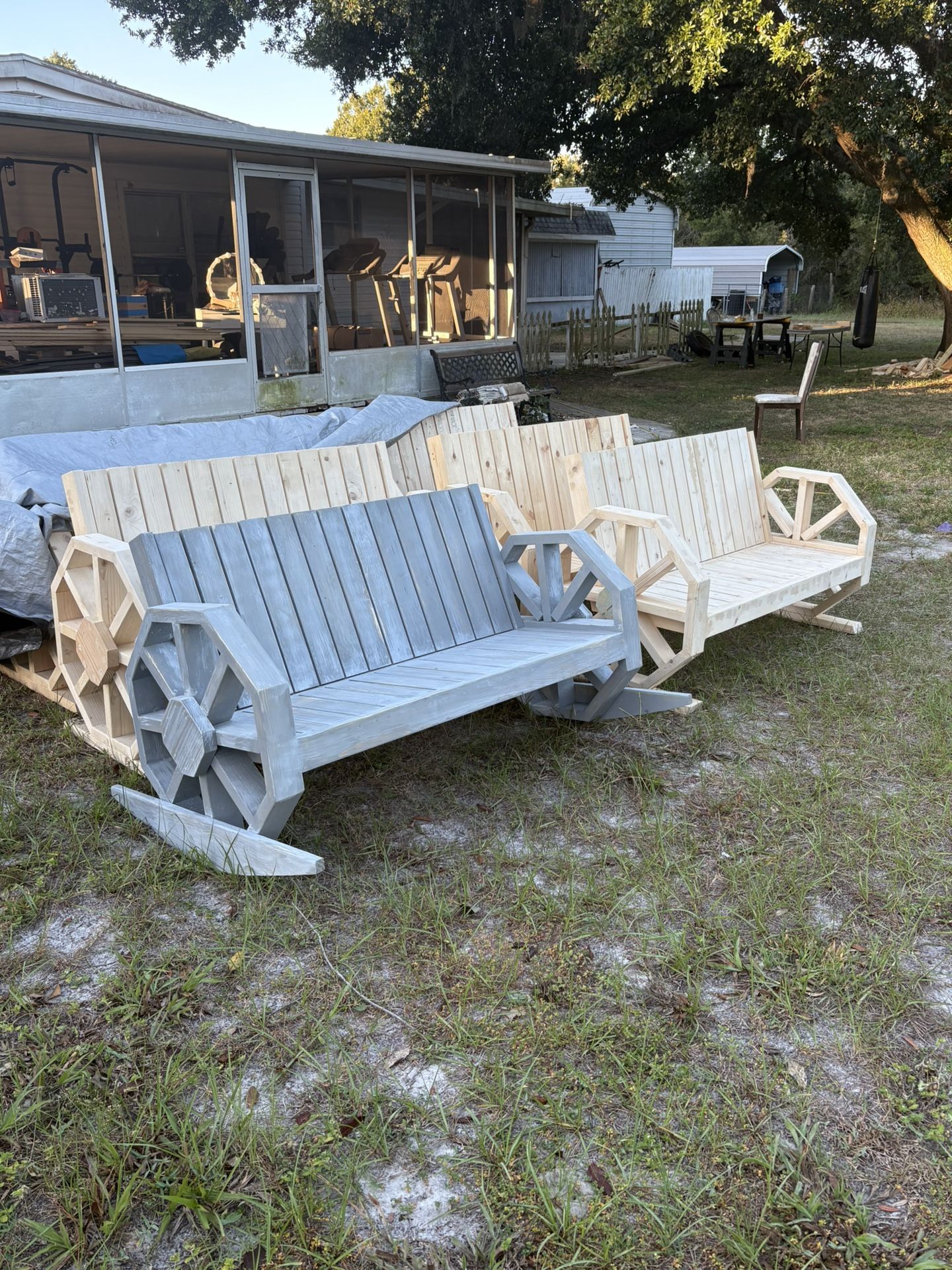 Beautiful wagon-style bench available in two versions — swing or stationary bench. Seats up to 3 people comfortably and measures 55” wide. Can be painted in your choice of color or left natural for a rustic look. Perfect for porches, gardens, or patios! Message me for details or to order yours today.